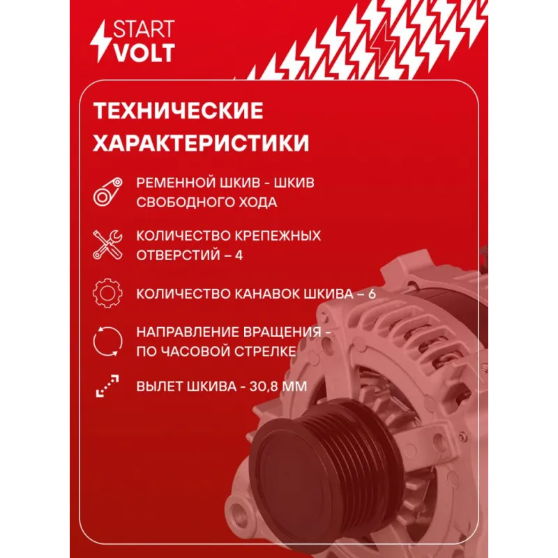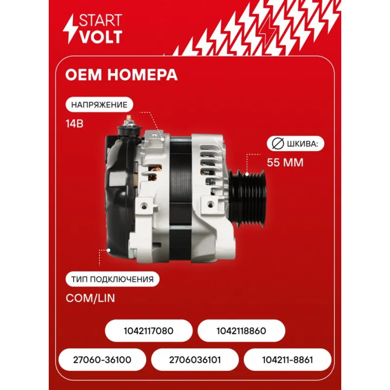 Генератор для автомобилей Lexus RX (15-)/NX (14-) 2.0T 150A Описание: Оригинальный генератор STARTVOLT LG 1956 рассчитан на ток 150 А и напряжение 14 В. Изготовлен аналогично оригинальной конструкции. Шкив свободного хода (6PK, диаметр 55 мм) полностью совместим с оригинальными агрегатами. Подходит для автомобилей: LEXUS NX, RX.. Если у вас есть вопросы по применяемости, мы всегда готовы помочь вам с подбором по VIN-НОМЕРУ ВАШЕГО АВТОМОБИЛЯ. Преимущества: - Полностью соответствует оригинальным узлам; - Высокоточная сборка с пооперационным контролем качества; - Каждый генератор проходит стендовое тестирование — протокол в комплекте; - Надёжность в любых условиях эксплуатации; - STARTVOLT 15 лет на рынке автоэлектрики — нам доверяют профессионалы; - Гарантия 2 года; - Сертифицирован по стандарту EAC (ЕАЭС) — соответствует требованиям безопасности и качества; Автомобильный генератор в сборе — готов к установке. Отличный выбор для надежной замены штатного генератора. Характеристики: Артикул: LG 1956 OEM номера: 27060-36100, 2706036101, 104211-8861, 1042117080, 1042118860 Направление вращения: По часовой стрелке Выходной ток, А: 150 Напряжение, В: 14 Вылет шкива, мм: 30,8 Тип подключения: COM/LIN Диаметр шкива, мм: 55 Ременной шкив: с ременным шкивом свободного хода Количество крепежных отверстий: 4 Количество канавок шкива: 6 IDE код: 25 Скорость сигнала: M Комплектация: Генератор - 1 шт Индивидуальный технический паспорт изделия (с фирменным ID) - 1 шт Паспорт изделия/гарантийный талон - 1 шт Гарантия: от 1 года.