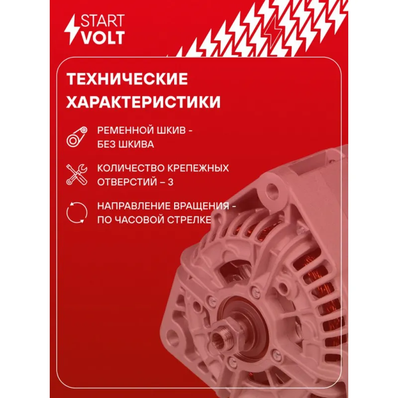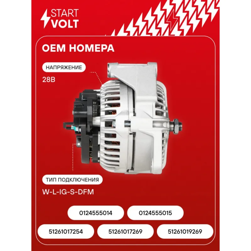 Генератор для автомобилей MAN TGA (00-) с дв. D2876/D2866 80A Описание: Оригинальный генератор STARTVOLT LG 1257 рассчитан на ток 80 А и напряжение 28 В. Изготовлен аналогично оригинальной конструкции. Полностью совместим с оригинальными агрегатами. Подходит для автомобилей: MAN TGA, SHAANXI SX 325.. Если у вас есть вопросы по применяемости, мы всегда готовы помочь вам с подбором по VIN-НОМЕРУ ВАШЕГО АВТОМОБИЛЯ. Преимущества: - Полностью соответствует оригинальным узлам; - Высокоточная сборка с пооперационным контролем качества; - Каждый генератор проходит стендовое тестирование — протокол в комплекте; - Надёжность в любых условиях эксплуатации; - STARTVOLT 15 лет на рынке автоэлектрики — нам доверяют профессионалы; - Гарантия 2 года; - Сертифицирован по стандарту EAC (ЕАЭС) — соответствует требованиям безопасности и качества; Автомобильный генератор в сборе — готов к установке. Отличный выбор для надежной замены штатного генератора. Характеристики: Артикул: LG 1257 OEM номера: 51261017254, 51261017269, 51261019269, 0124555014, 0124555015 Направление вращения: По часовой стрелке Выходной ток, А: 80 Напряжение, В: 28 Тип подключения: W-L-IG-S-DFM Ременной шкив: Без шкива Количество крепежных отверстий: 3 Комплектация: Индивидуальный технический паспорт изделия (с фирменным ID) - 1 шт Паспорт изделия/гарантийный талон - 1 шт Генератор - 1 шт Гарантия: от 1 года.