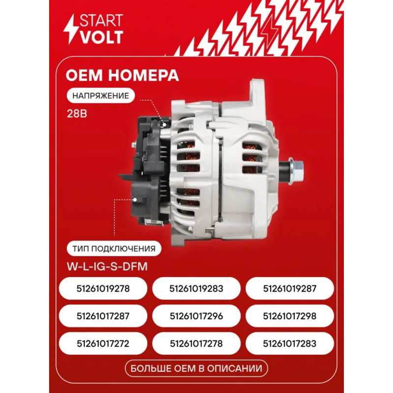 Генератор для автомобилей MAN TGS (07-)/TGX (07-)/TGA (02-) с дв. D2066/D2876 120A Описание: Оригинальный генератор STARTVOLT LG 1254 рассчитан на ток 120 А и напряжение 28 В. Изготовлен аналогично оригинальной конструкции. Полностью совместим с оригинальными агрегатами. Подходит для автомобилей: MAN TGX, TGS, TGM, TGL, TGA, NEOPLAN TRENDLINER.. Если у вас есть вопросы по применяемости, мы всегда готовы помочь вам с подбором по VIN-НОМЕРУ ВАШЕГО АВТОМОБИЛЯ. Преимущества: - Полностью соответствует оригинальным узлам; - Высокоточная сборка с пооперационным контролем качества; - Каждый генератор проходит стендовое тестирование — протокол в комплекте; - Надёжность в любых условиях эксплуатации; - STARTVOLT 15 лет на рынке автоэлектрики — нам доверяют профессионалы; - Гарантия 2 года; - Сертифицирован по стандарту EAC (ЕАЭС) — соответствует требованиям безопасности и качества; Автомобильный генератор в сборе — готов к установке. Отличный выбор для надежной замены штатного генератора. Характеристики: Артикул: LG 1254 OEM номера: 51 26101 7272, 51 26101 7278, 51 26101 7283, 51 26101 7287, 51 26101 7296, 51 26101 7298, 51 26101 9278, 51 26101 9283, 51 26101 9287, 0 124 655 025, 0 124 655 243, 0 124 655 244, 0 124 655 597, 0 124 655 598, 0 986 049 820, 0986082930, 1986A00517, 1986A00974, 1986A00997, 51261017314, 51261017315, 51261019296, 51261019314 Напряжение, В: 28 Выходной ток, А: 120 Тип подключения: W-L-IG-S-DFM Ременной шкив: Без шкива Количество крепежных отверстий: 3 Направление вращения: По часовой стрелке Комплектация: Паспорт изделия/гарантийный талон - 1 шт Генератор - 1 шт Индивидуальный технический паспорт изделия (с фирменным ID) - 1 шт Гарантия: от 1 года.