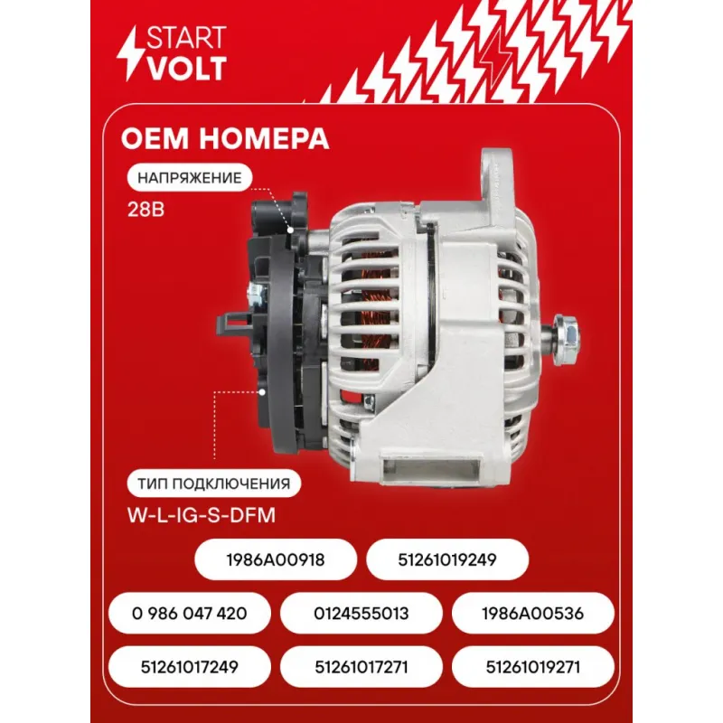 Генератор для автомобилей MAN TGS (07-)/TGX (07-)/TGA (02-) с дв. D2066/D2876 80A Описание: Оригинальный генератор STARTVOLT LG 1252 рассчитан на ток 80 А и напряжение 28 В. Изготовлен аналогично оригинальной конструкции. Полностью совместим с оригинальными агрегатами. Подходит для автомобилей: MAN TGA, TGS, TGX, TGL, TGM.. Если у вас есть вопросы по применяемости, мы всегда готовы помочь вам с подбором по VIN-НОМЕРУ ВАШЕГО АВТОМОБИЛЯ. Преимущества: - Полностью соответствует оригинальным узлам; - Высокоточная сборка с пооперационным контролем качества; - Каждый генератор проходит стендовое тестирование — протокол в комплекте; - Надёжность в любых условиях эксплуатации; - STARTVOLT 15 лет на рынке автоэлектрики — нам доверяют профессионалы; - Гарантия 2 года; - Сертифицирован по стандарту EAC (ЕАЭС) — соответствует требованиям безопасности и качества; Автомобильный генератор в сборе — готов к установке. Отличный выбор для надежной замены штатного генератора. Характеристики: Артикул: LG 1252 OEM номера: 51 26101 7249, 51 26101 7271, 51 26101 9271, 0 986 047 420, 0124555013, 1986A00536, 1986A00918, 51261019249 Напряжение, В: 28 Выходной ток, А: 80 Тип подключения: W-L-IG-S-DFM Ременной шкив: Без шкива Количество крепежных отверстий: 3 Направление вращения: По часовой стрелке Подходит для авто: MAN TGA (00-), TGL (05-), TGS (07-) Для проверки применяемости отправьте VIN автомобиля через вкладку "Есть вопросы о товаре?" Комплектация: Индивидуальный технический паспорт изделия (с фирменным ID) - 1 шт Паспорт изделия/гарантийный талон - 1 шт Генератор - 1 шт Гарантия: от 1 года.