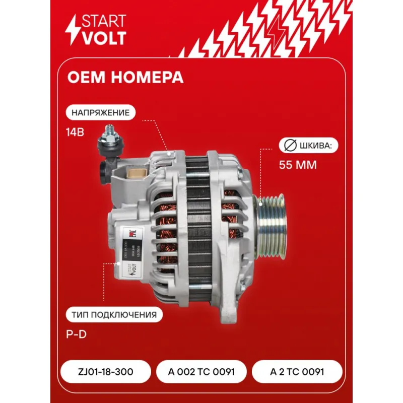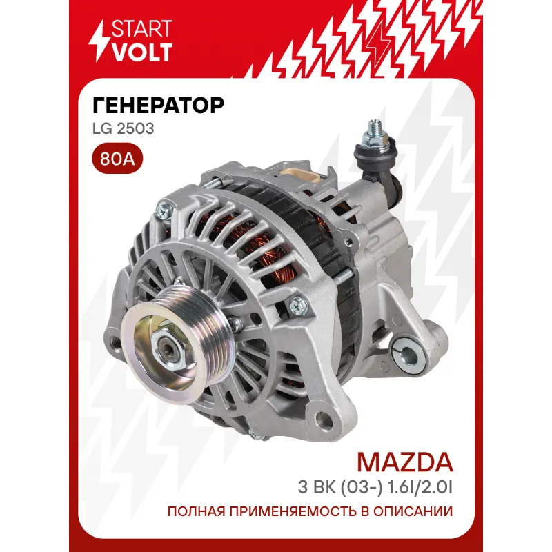 Генератор для автомобилей Mazda 3 BK (03-) 1.6i/2.0i 80A Описание: Оригинальный генератор STARTVOLT LG 2503 рассчитан на ток 80 А и напряжение 14 В. Изготовлен аналогично оригинальной конструкции. с многоручейковым ручейковым шкивом шкив (6PK, диаметр 55 мм) полностью совместим с оригинальными агрегатами. Подходит для автомобилей: MAZDA CX-5, 6, 3, MAZDA (FAW) 6.. Если у вас есть вопросы по применяемости, мы всегда готовы помочь вам с подбором по VIN-НОМЕРУ ВАШЕГО АВТОМОБИЛЯ. Преимущества: - Полностью соответствует оригинальным узлам; - Высокоточная сборка с пооперационным контролем качества; - Каждый генератор проходит стендовое тестирование — протокол в комплекте; - Надёжность в любых условиях эксплуатации; - STARTVOLT 15 лет на рынке автоэлектрики — нам доверяют профессионалы; - Гарантия 2 года; - Сертифицирован по стандарту EAC (ЕАЭС) — соответствует требованиям безопасности и качества; Автомобильный генератор в сборе — готов к установке. Отличный выбор для надежной замены штатного генератора. Характеристики: Артикул: LG 2503 OEM номера: ZJ01-18-300, A 002 TC 0091, A 2 TC 0091 Напряжение, В: 14 Выходной ток, А: 80 Тип подключения: P-D Диаметр шкива, мм: 55 Ременной шкив: с многоручейковым ручейковым шкивом Количество крепежных отверстий: 2 Количество канавок шкива: 6 Направление вращения: По часовой стрелке Вылет шкива, мм: 14,1 Подходит для авто: Mazda CX-5 (12-), 6 (13-) Для проверки применяемости отправьте VIN автомобиля через вкладку "Есть вопросы о товаре?" Комплектация: Индивидуальный технический паспорт изделия (с фирменным ID) - 1 шт Паспорт изделия/гарантийный талон - 1 шт Генератор - 1 шт Гарантия: от 1 года.