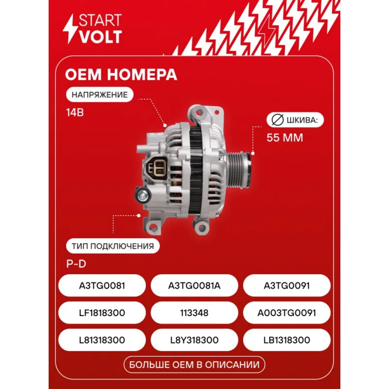 Генератор для автомобилей Mazda 6 GG (02-) 1.8i/2.0i/2.3i 90A Описание: Оригинальный генератор STARTVOLT LG 25LF рассчитан на ток 90 А и напряжение 14 В. Изготовлен аналогично оригинальной конструкции. Шкив свободного хода (6PK, диаметр 55 мм) полностью совместим с оригинальными агрегатами. Подходит для автомобилей: MAZDA 6.. Если у вас есть вопросы по применяемости, мы всегда готовы помочь вам с подбором по VIN-НОМЕРУ ВАШЕГО АВТОМОБИЛЯ. Преимущества: - Полностью соответствует оригинальным узлам; - Высокоточная сборка с пооперационным контролем качества; - Каждый генератор проходит стендовое тестирование — протокол в комплекте; - Надёжность в любых условиях эксплуатации; - STARTVOLT 15 лет на рынке автоэлектрики — нам доверяют профессионалы; - Гарантия 2 года; - Сертифицирован по стандарту EAC (ЕАЭС) — соответствует требованиям безопасности и качества; Автомобильный генератор в сборе — готов к установке. Отличный выбор для надежной замены штатного генератора. Характеристики: Артикул: LG 25LF OEM номера: L81318300, L8Y318300, LB1318300, LF1818300, 113348, A003TG0091, A3TG0081, A3TG0081A, A3TG0091, LFY818300, ALMT010, A003TG0081, 0 986 080 320 Напряжение, В: 14 Выходной ток, А: 90 Тип подключения: P-D Диаметр шкива, мм: 55 Ременной шкив: с ременным шкивом свободного хода Количество крепежных отверстий: 3 Количество канавок шкива: 6 Направление вращения: По часовой стрелке Вылет шкива, мм: 40,4 Сопутствующий товар: Шкивы генераторов с обгонной муфтой: SGP 25LF Подходит для авто: Mazda 6 (02-) Для проверки применяемости отправьте VIN автомобиля через вкладку "Есть вопросы о товаре?" Комплектация: Индивидуальный технический паспорт изделия (с фирменным ID) - 1 шт Генератор - 1 шт Паспорт изделия/гарантийный талон - 1 шт Гарантия: от 1 года.