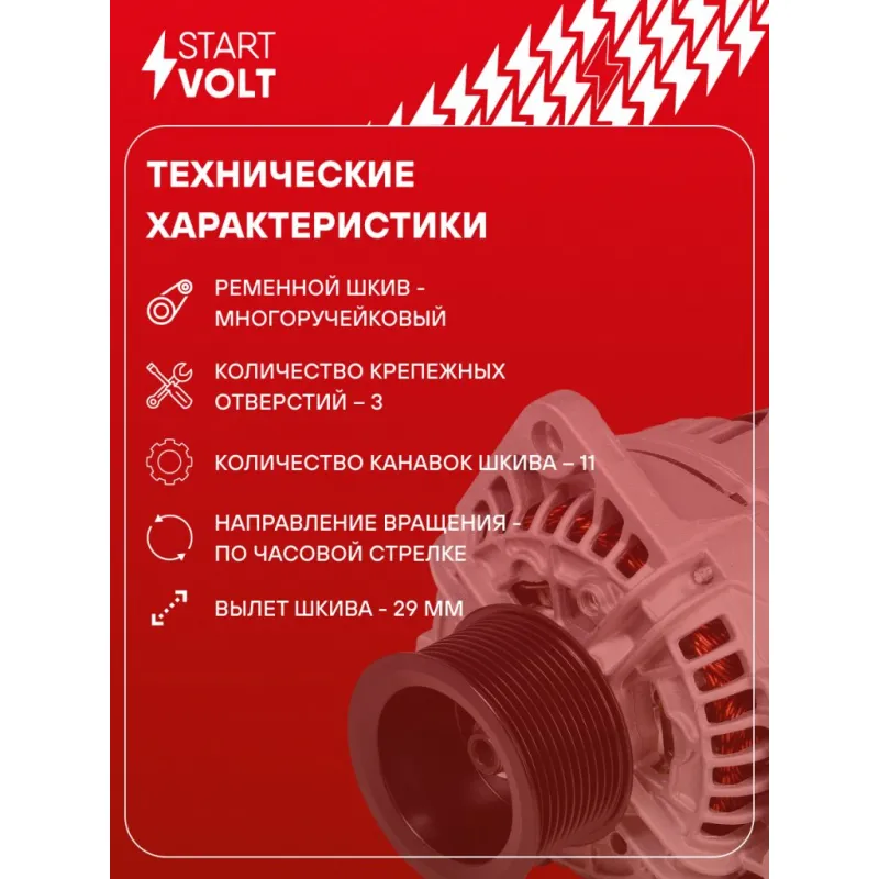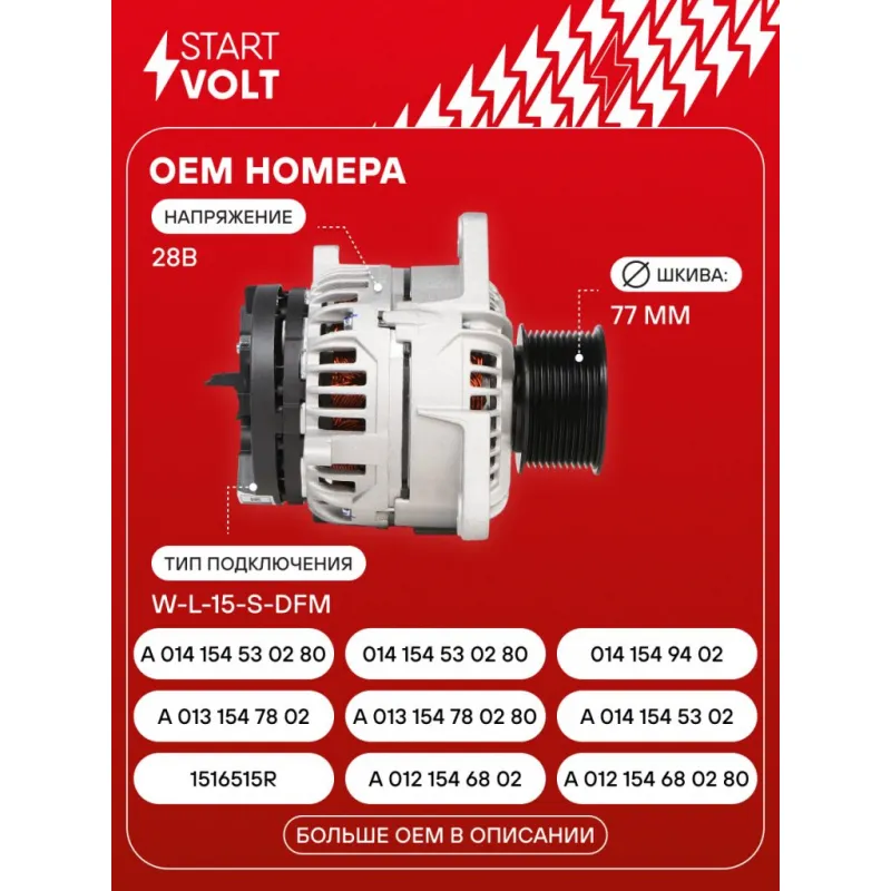 Генератор для автомобилей Mercedes-Benz Actros MP2/MP3 (03-) с дв. OM541/Axor (01-) с дв. OM457 80A Описание: Оригинальный генератор STARTVOLT LG 1599 рассчитан на ток 80 А и напряжение 28 В. Изготовлен аналогично оригинальной конструкции. с многоручейковым ручейковым шкивом шкив (11PK, диаметр 77 мм) полностью совместим с оригинальными агрегатами. Подходит для автомобилей: MERCEDES-BENZ ACTROS, ATEGO, AXOR, CITARO, CONECTO, ECONIC, TOURINO, UNIMOG, ZETROS.. Если у вас есть вопросы по применяемости, мы всегда готовы помочь вам с подбором по VIN-НОМЕРУ ВАШЕГО АВТОМОБИЛЯ. Преимущества: - Полностью соответствует оригинальным узлам; - Высокоточная сборка с пооперационным контролем качества; - Каждый генератор проходит стендовое тестирование — протокол в комплекте; - Надёжность в любых условиях эксплуатации; - STARTVOLT 15 лет на рынке автоэлектрики — нам доверяют профессионалы; - Гарантия 2 года; - Сертифицирован по стандарту EAC (ЕАЭС) — соответствует требованиям безопасности и качества; Автомобильный генератор в сборе — готов к установке. Отличный выбор для надежной замены штатного генератора. Характеристики: Артикул: LG 1599 OEM номера: 1516515R, A 012 154 68 02, A 012 154 68 02 80, A 013 154 78 02, A 013 154 78 02 80, A 014 154 53 02, A 014 154 53 02 80, 014 154 53 02 80, 014 154 94 02, 121546802, 131547802, 141545302, 141549402, A 014 154 94 02, 012 154 68 02, 012 154 68 02 80, 013 154 78 02, 013 154 78 02 80, 014 154 53 02, 0 986 048 100, 0124555001, 0124555004, 0124555007, 0124555012, 0124555022, 0124555032, 0124555065, 0124555168 Напряжение, В: 28 Выходной ток, А: 80 Тип подключения: W-L-15-S-DFM Диаметр шкива, мм: 77 Ременной шкив: с многоручейковым ручейковым шкивом Количество крепежных отверстий: 3 Количество канавок шкива: 11 Направление вращения: По часовой стрелке Вылет шкива, мм: 29 Комплектация: Генератор - 1 шт Индивидуальный технический паспорт изделия (с фирменным ID) - 1 шт Паспорт изделия/гарантийный талон - 1 шт Гарантия: от 1 года.