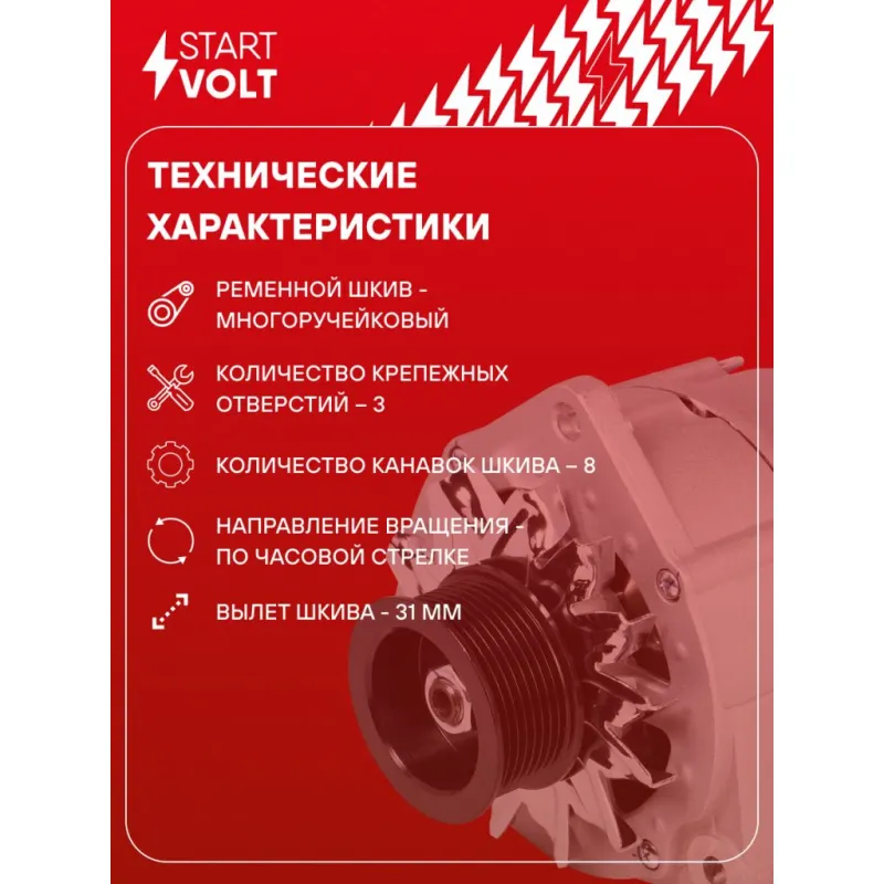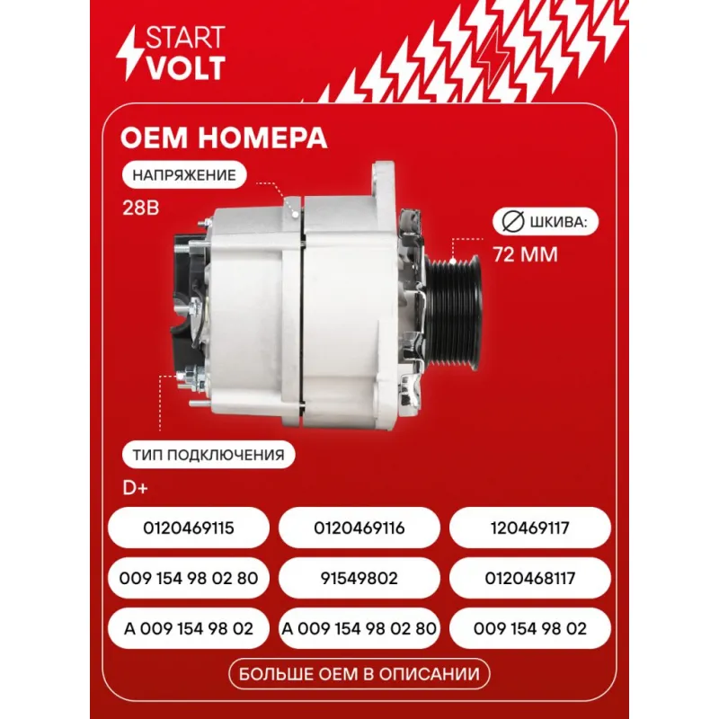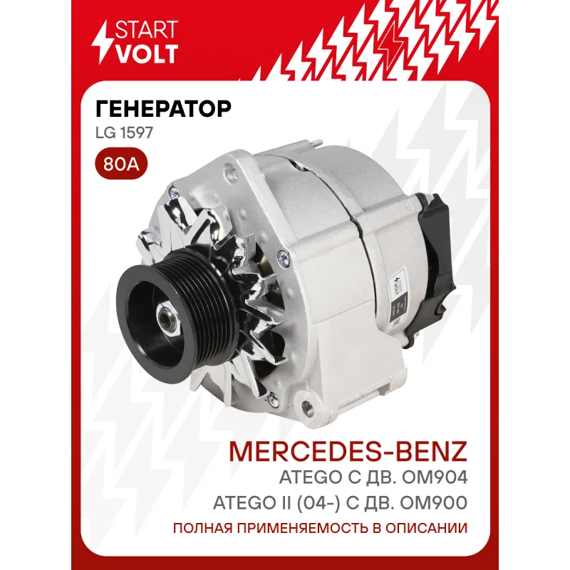 Генератор для автомобилей Mercedes-Benz Atego II (04-) с дв. OM900/Atego с дв. OM904 80А Описание: Оригинальный генератор STARTVOLT LG 1597 рассчитан на ток 80 А и напряжение 28 В. Изготовлен аналогично оригинальной конструкции. с многоручейковым ручейковым шкивом шкив (8PK, диаметр 72 мм) полностью совместим с оригинальными агрегатами. Подходит для автомобилей: MAZ 107, 203, MERCEDES-BENZ LK/LN2, ATEGO, ECONIC, UNIMOG, AXOR, ZETROS, TOURO, ACCELO.. Если у вас есть вопросы по применяемости, мы всегда готовы помочь вам с подбором по VIN-НОМЕРУ ВАШЕГО АВТОМОБИЛЯ. Преимущества: - Полностью соответствует оригинальным узлам; - Высокоточная сборка с пооперационным контролем качества; - Каждый генератор проходит стендовое тестирование — протокол в комплекте; - Надёжность в любых условиях эксплуатации; - STARTVOLT 15 лет на рынке автоэлектрики — нам доверяют профессионалы; - Гарантия 2 года; - Сертифицирован по стандарту EAC (ЕАЭС) — соответствует требованиям безопасности и качества; Автомобильный генератор в сборе — готов к установке. Отличный выбор для надежной замены штатного генератора. Характеристики: Артикул: LG 1597 OEM номера: A 009 154 98 02, A 009 154 98 02 80, 009 154 98 02, 009 154 98 02 80, 91549802, 0120468117, 0120469115, 0120469116, 0120469117, 0120469118 Напряжение, В: 28 Выходной ток, А: 80 Тип подключения: D+ Диаметр шкива, мм: 72 Ременной шкив: с многоручейковым ручейковым шкивом Количество крепежных отверстий: 3 Количество канавок шкива: 8 Направление вращения: По часовой стрелке Вылет шкива, мм: 31 Комплектация: Паспорт изделия/гарантийный талон - 1 шт Генератор - 1 шт Индивидуальный технический паспорт изделия (с фирменным ID) - 1 шт Гарантия: от 1 года.