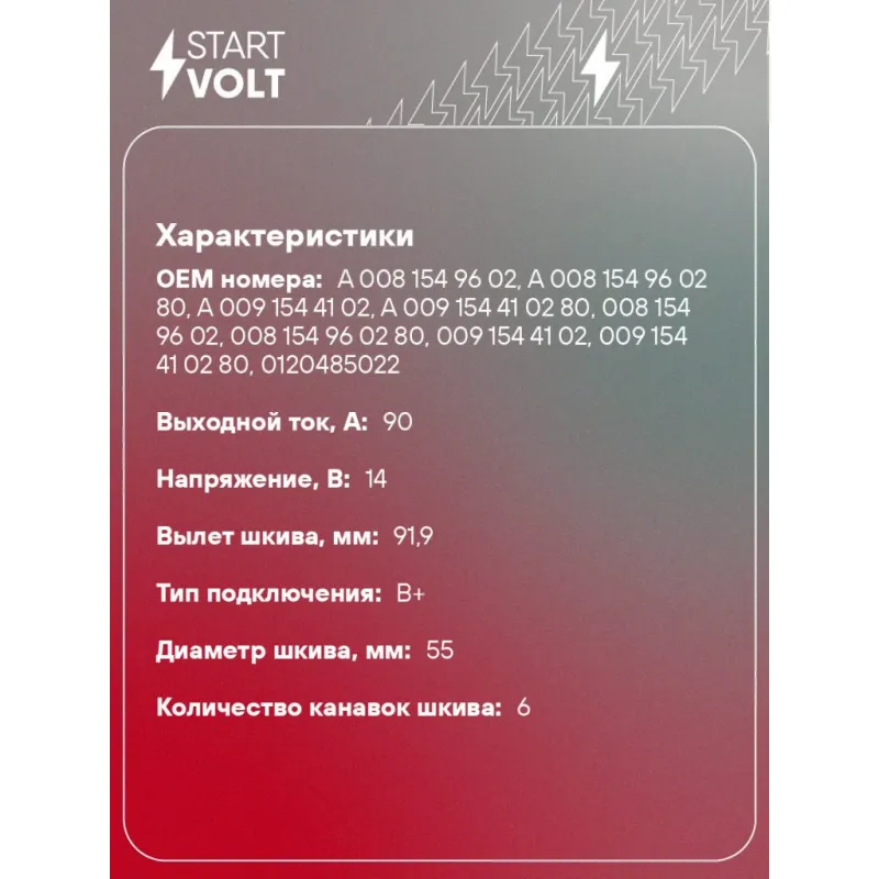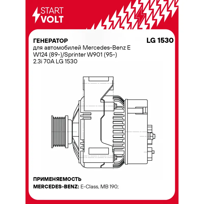 Генератор для автомобилей Mercedes-Benz E W124 (89-)/Sprinter W901 (95-) 2.3i 70A Характеристики: Артикул: LG 1530 OEM номера: A 008 154 96 02, A 008 154 96 02 80, A 009 154 41 02, A 009 154 41 02 80, 008 154 96 02, 008 154 96 02 80, 009 154 41 02, 009 154 41 02 80, 0120485022 Направление вращения: по часовой стрелке Выходной ток, А: 90 Напряжение, В: 14 Вылет шкива, мм: 91,9 Тип подключения: B+ Диаметр шкива, мм: 55 Ременной шкив: с многоручейковым ручейковым шкивом Количество крепежных отверстий: 2 Количество канавок шкива: 6 Комплектация: Генератор - 1 шт Паспорт изделия/гарантийный талон - 1 шт Индивидуальный технический паспорт изделия (с фирменным ID) - 1 шт Гарантия: от 1 года.