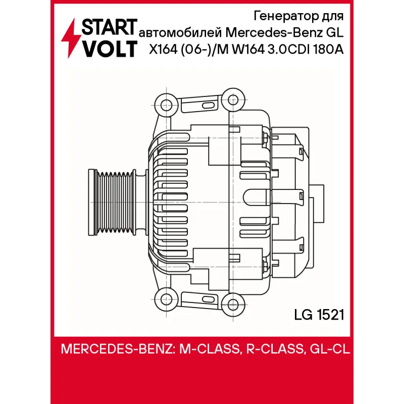 Генератор для автомобилей Mercedes-Benz GL X164 (06-)/M W164 (05-) 3.0CDI 180A Характеристики: Артикул: LG 1521 OEM номера: A 642 154 03 02, A 642 154 05 02, 642 154 05 02, 439583, TG17C032 Направление вращения: по часовой стрелке Выходной ток, А: 180 Напряжение, В: 14 Вылет шкива, мм: 31,5 Тип подключения: COM/LIN Диаметр шкива, мм: 50 Ременной шкив: с ременным шкивом свободного хода Количество крепежных отверстий: 4 Количество канавок шкива: 8 IDE код: 33 Скорость сигнала: H Комплектация: Индивидуальный технический паспорт изделия (с фирменным ID) - 1 шт Генератор - 1 шт Паспорт изделия/гарантийный талон - 1 шт Гарантия: от 1 года.