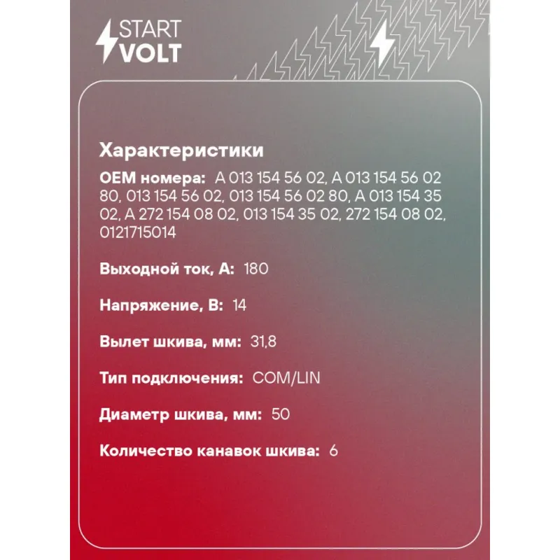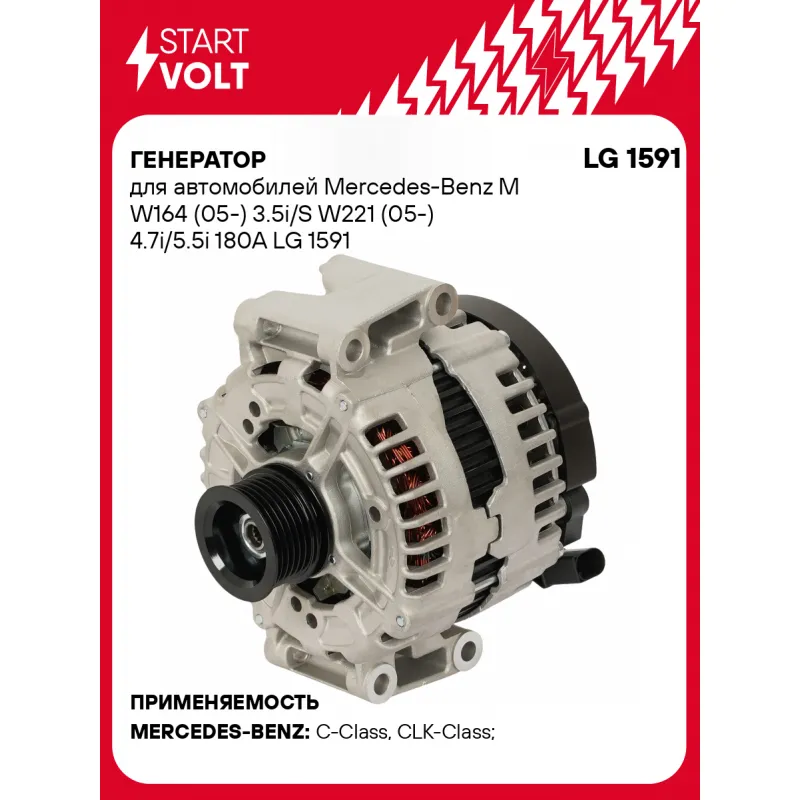 Генератор для автомобилей Mercedes-Benz M W164 (05-) 3.5i/S W221 (05-) 4.7i/5.5i 180A Описание: Оригинальный генератор STARTVOLT LG 1591 рассчитан на ток 180 А и напряжение 14 В. Изготовлен аналогично оригинальной конструкции. Многоручейковый ременной шкив (6PK, диаметр 50 мм) полностью совместим с оригинальными агрегатами. Подходит для автомобилей: MERCEDES-BENZ C-Class, CLK, CLS, E-Class, G-Class, GL-Class, M-Class, R-Class, S-Class, SL.. Если у вас есть вопросы по применяемости, мы всегда готовы помочь вам с подбором по VIN-НОМЕРУ ВАШЕГО АВТОМОБИЛЯ. Преимущества: - Полностью соответствует оригинальным узлам; - Высокоточная сборка с пооперационным контролем качества; - Каждый генератор проходит стендовое тестирование — протокол в комплекте; - Надёжность в любых условиях эксплуатации; - STARTVOLT 15 лет на рынке автоэлектрики — нам доверяют профессионалы; - Гарантия 2 года; - Сертифицирован по стандарту EAC (ЕАЭС) — соответствует требованиям безопасности и качества; Автомобильный генератор в сборе — готов к установке. Отличный выбор для надежной замены штатного генератора. Характеристики: Артикул: LG 1591 OEM номера: A 013 154 56 02, A 013 154 56 02 80, 013 154 56 02, 013 154 56 02 80, A 013 154 35 02, A 272 154 08 02, 013 154 35 02, 272 154 08 02, 0121715014, 0121715114, 0986047650, 0 121 715 006, 442272 Направление вращения: по часовой стрелке Выходной ток, А: 180 Напряжение, В: 14 Вылет шкива, мм: 31,8 Тип подключения: COM/LIN Диаметр шкива, мм: 50 Ременной шкив: с многоручейковым ручейковым шкивом Количество крепежных отверстий: 4 Количество канавок шкива: 6 Комплектация: Генератор - 1 шт Паспорт изделия/гарантийный талон - 1 шт Индивидуальный технический паспорт изделия (с фирменным ID) - 1 шт Гарантия: от 1 года.