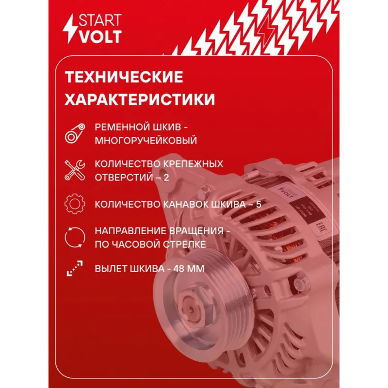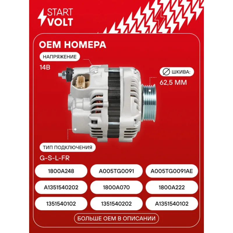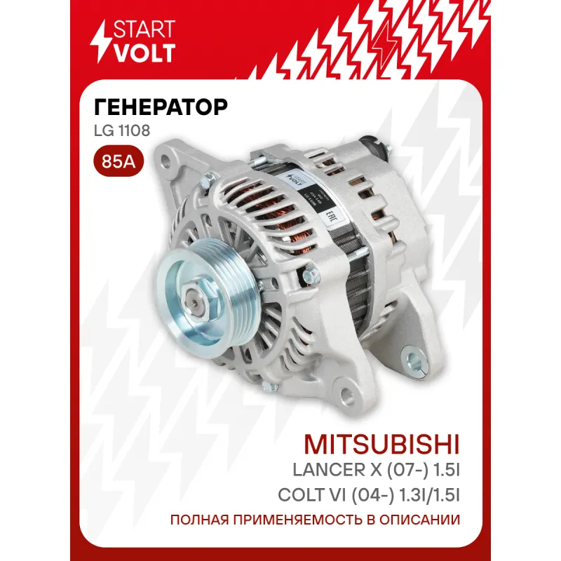 Генератор для автомобилей Mitsubishi Lancer X (07-) 1.5i/Colt VI (04-) 1.3i/1.5i 85A Описание: Оригинальный генератор STARTVOLT LG 1108 рассчитан на ток 85 А и напряжение 14 В. Изготовлен аналогично оригинальной конструкции. с многоручейковым ручейковым шкивом шкив (5PK, диаметр 62,5 мм) полностью совместим с оригинальными агрегатами. Подходит для автомобилей: MITSUBISHI COLT, LANCER, SMART FORFOUR.. Если у вас есть вопросы по применяемости, мы всегда готовы помочь вам с подбором по VIN-НОМЕРУ ВАШЕГО АВТОМОБИЛЯ. Преимущества: - Полностью соответствует оригинальным узлам; - Высокоточная сборка с пооперационным контролем качества; - Каждый генератор проходит стендовое тестирование — протокол в комплекте; - Надёжность в любых условиях эксплуатации; - STARTVOLT 15 лет на рынке автоэлектрики — нам доверяют профессионалы; - Гарантия 2 года; - Сертифицирован по стандарту EAC (ЕАЭС) — соответствует требованиям безопасности и качества; Автомобильный генератор в сборе — готов к установке. Отличный выбор для надежной замены штатного генератора. Характеристики: Артикул: LG 1108 OEM номера: 1351540102, 1351540202, A1351540102, A1351540202, 1800A070, 1800A222, 1800A248, A005TG0091, A005TG0091AE, A005TG0091BE, MN155953, A005TG0091ZE, A5TG0091, A5TG0091AE, A5TG0091BE, A5TG0091ZE, A5TG1691ZE Направление вращения: По часовой стрелке Выходной ток, А: 85 Напряжение, В: 14 Вылет шкива, мм: 48 Тип подключения: G-S-L-FR Диаметр шкива, мм: 62,5 Ременной шкив: с многоручейковым ручейковым шкивом Количество крепежных отверстий: 2 Количество канавок шкива: 5 Комплектация: Паспорт изделия/гарантийный талон - 1 шт Генератор - 1 шт Индивидуальный технический паспорт изделия (с фирменным ID) - 1 шт Гарантия: от 1 года.
