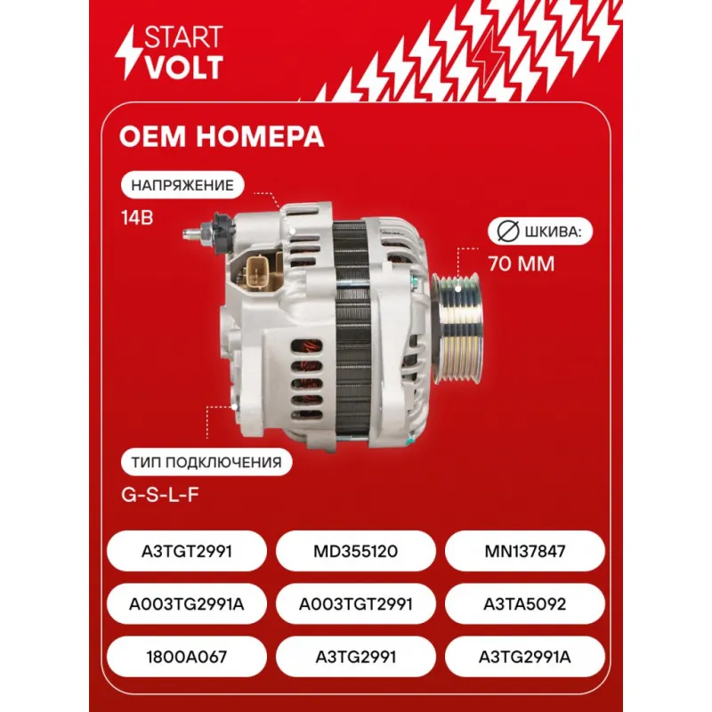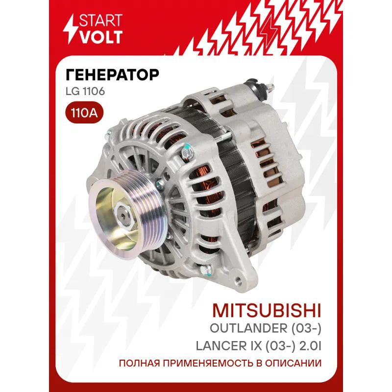 Генератор для автомобилей Mitsubishi Outlander (03-)/Lancer IX (03-) 2.0i 110A Описание: Оригинальный генератор STARTVOLT LG 1106 рассчитан на ток 110 А и напряжение 14 В. Изготовлен аналогично оригинальной конструкции. с многоручейковым ручейковым шкивом шкив (6PK, диаметр 70 мм) полностью совместим с оригинальными агрегатами. Подходит для автомобилей: MITSUBISHI OUTLANDER, LANCER.. Если у вас есть вопросы по применяемости, мы всегда готовы помочь вам с подбором по VIN-НОМЕРУ ВАШЕГО АВТОМОБИЛЯ. Преимущества: - Полностью соответствует оригинальным узлам; - Высокоточная сборка с пооперационным контролем качества; - Каждый генератор проходит стендовое тестирование — протокол в комплекте; - Надёжность в любых условиях эксплуатации; - STARTVOLT 15 лет на рынке автоэлектрики — нам доверяют профессионалы; - Гарантия 2 года; - Сертифицирован по стандарту EAC (ЕАЭС) — соответствует требованиям безопасности и качества; Автомобильный генератор в сборе — готов к установке. Отличный выбор для надежной замены штатного генератора. Характеристики: Артикул: LG 1106 OEM номера: 1800A067, A3TG2991, A3TG2991A, A003TG2991A, A003TGT2991, A3TA5092, A3TGT2991, MD355120, MN137847 Напряжение, В: 14 Выходной ток, А: 110 Тип подключения: G-S-L-F Диаметр шкива, мм: 70 Ременной шкив: с многоручейковым ручейковым шкивом Количество крепежных отверстий: 2 Количество канавок шкива: 6 Направление вращения: По часовой стрелке Вылет шкива, мм: 43,1 Комплектация: Индивидуальный технический паспорт изделия (с фирменным ID) - 1 шт Паспорт изделия/гарантийный талон - 1 шт Генератор - 1 шт Гарантия: от 1 года.