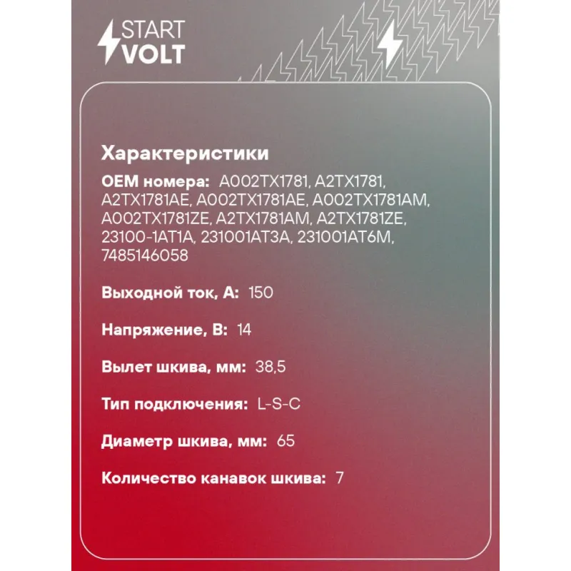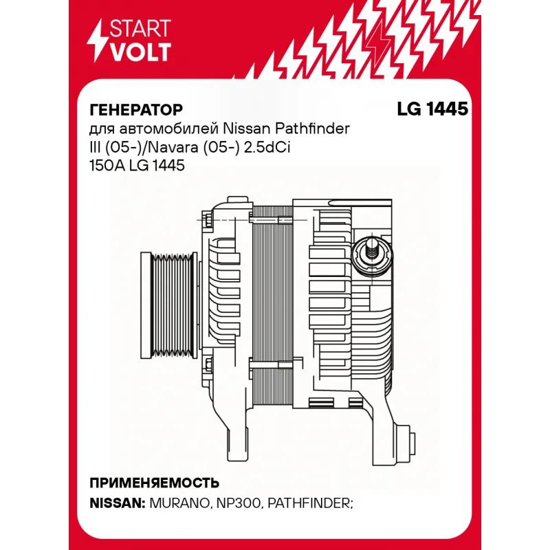 Генератор для автомобилей Nissan Pathfinder III (05-)/Navara (05-) 2.5dCi 150A Характеристики: Артикул: LG 1445 OEM номера: A002TX1781, A2TX1781, A2TX1781AE, A002TX1781AE, A002TX1781AM, A002TX1781ZE, A2TX1781AM, A2TX1781ZE, 23100-1AT1A, 231001AT3A, 231001AT6M, 7485146058 Направление вращения: по часовой стрелке Выходной ток, А: 150 Напряжение, В: 14 Вылет шкива, мм: 38,5 Тип подключения: L-S-C Диаметр шкива, мм: 65 Ременной шкив: с ременным шкивом свободного хода Количество крепежных отверстий: 2 Количество канавок шкива: 7 Комплектация: Индивидуальный технический паспорт изделия (с фирменным ID) - 1 шт Генератор - 1 шт Паспорт изделия/гарантийный талон - 1 шт Гарантия: от 1 года.