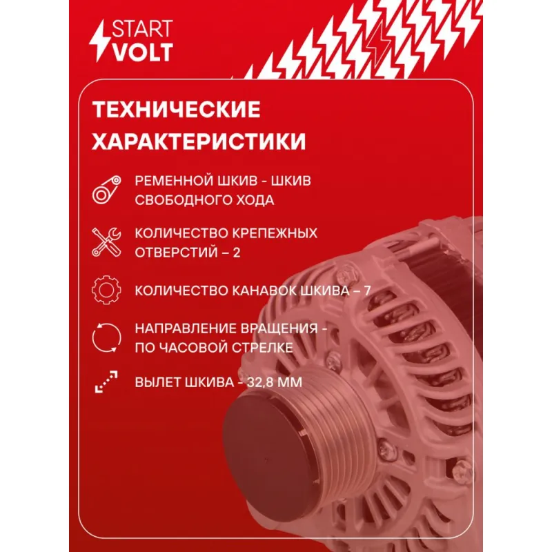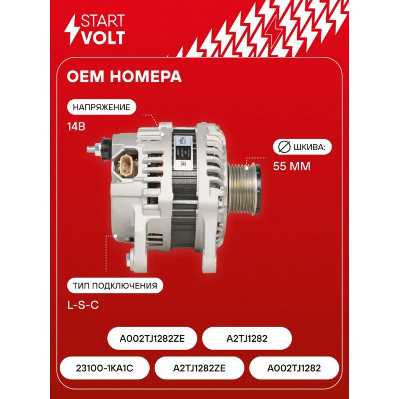 Генератор для автомобилей Nissan Qashqai J10 (06-) 1.6i 110A Описание: Оригинальный генератор STARTVOLT LG 1407 рассчитан на ток 110 А и напряжение 14 В. Изготовлен аналогично оригинальной конструкции. Шкив свободного хода (7PK, диаметр 55 мм) полностью совместим с оригинальными агрегатами. Подходит для автомобилей: NISSAN QASHQAI.. Если у вас есть вопросы по применяемости, мы всегда готовы помочь вам с подбором по VIN-НОМЕРУ ВАШЕГО АВТОМОБИЛЯ. Преимущества: - Полностью соответствует оригинальным узлам; - Высокоточная сборка с пооперационным контролем качества; - Каждый генератор проходит стендовое тестирование — протокол в комплекте; - Надёжность в любых условиях эксплуатации; - STARTVOLT 15 лет на рынке автоэлектрики — нам доверяют профессионалы; - Гарантия 2 года; - Сертифицирован по стандарту EAC (ЕАЭС) — соответствует требованиям безопасности и качества; Автомобильный генератор в сборе — готов к установке. Отличный выбор для надежной замены штатного генератора. Характеристики: Артикул: LG 1407 OEM номера: 23100-1KA1C, A2TJ1282ZE, A002TJ1282, A002TJ1282ZE, A2TJ1282 Напряжение, В: 14 Выходной ток, А: 110 Тип подключения: L-S-C Диаметр шкива, мм: 55 Ременной шкив: с ременным шкивом свободного хода Количество крепежных отверстий: 2 Количество канавок шкива: 7 Направление вращения: По часовой стрелке Вылет шкива, мм: 32,8 Комплектация: Генератор - 1 шт Индивидуальный технический паспорт изделия (с фирменным ID) - 1 шт Паспорт изделия/гарантийный талон - 1 шт Гарантия: от 1 года.
