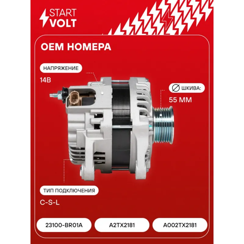 Генератор для автомобилей Nissan Qashqai J10 (06-) 1.6i 150A Описание: Оригинальный генератор STARTVOLT LG 1408 рассчитан на ток 150 А и напряжение 14 В. Изготовлен аналогично оригинальной конструкции. с многоручейковым ручейковым шкивом шкив (7PK, диаметр 55 мм) полностью совместим с оригинальными агрегатами. Подходит для автомобилей: NISSAN QASHQAI.. Если у вас есть вопросы по применяемости, мы всегда готовы помочь вам с подбором по VIN-НОМЕРУ ВАШЕГО АВТОМОБИЛЯ. Преимущества: - Полностью соответствует оригинальным узлам; - Высокоточная сборка с пооперационным контролем качества; - Каждый генератор проходит стендовое тестирование — протокол в комплекте; - Надёжность в любых условиях эксплуатации; - STARTVOLT 15 лет на рынке автоэлектрики — нам доверяют профессионалы; - Гарантия 2 года; - Сертифицирован по стандарту EAC (ЕАЭС) — соответствует требованиям безопасности и качества; Автомобильный генератор в сборе — готов к установке. Отличный выбор для надежной замены штатного генератора. Характеристики: Артикул: LG 1408 OEM номера: 23100-BR01A, A2TX2181, A002TX2181 Напряжение, В: 14 Выходной ток, А: 150 Тип подключения: C-S-L Диаметр шкива, мм: 55 Ременной шкив: с многоручейковым ручейковым шкивом Количество крепежных отверстий: 2 Количество канавок шкива: 7 Направление вращения: По часовой стрелке Вылет шкива, мм: 33 Подходит для авто: Nissan Qashqai J10 (06-) Для проверки применяемости отправьте VIN автомобиля через вкладку "Есть вопросы о товаре?" Комплектация: Генератор - 1 шт Паспорт изделия/гарантийный талон - 1 шт Индивидуальный технический паспорт изделия (с фирменным ID) - 1 шт Гарантия: от 1 года.