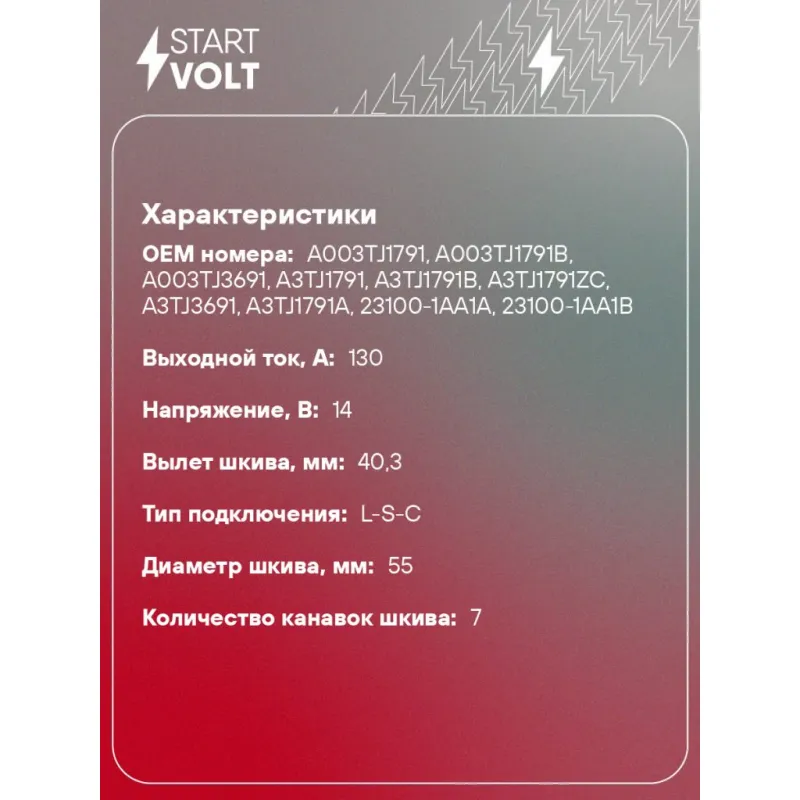 Генератор для автомобилей Nissan Teana J32 (08-) 2.5i/3.5i 130A Характеристики: Артикул: LG 1402 OEM номера: A003TJ1791, A003TJ1791B, A003TJ3691, A3TJ1791, A3TJ1791B, A3TJ1791ZC, A3TJ3691, A3TJ1791A, 23100-1AA1A, 23100-1AA1B Направление вращения: по часовой стрелке Выходной ток, А: 130 Напряжение, В: 14 Вылет шкива, мм: 40,3 Тип подключения: L-S-C Диаметр шкива, мм: 55 Ременной шкив: с многоручейковым ручейковым шкивом Количество крепежных отверстий: 2 Количество канавок шкива: 7 Комплектация: Генератор - 1 шт Паспорт изделия/гарантийный талон - 1 шт Индивидуальный технический паспорт изделия (с фирменным ID) - 1 шт Гарантия: от 1 года.