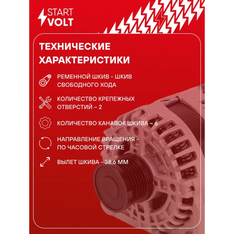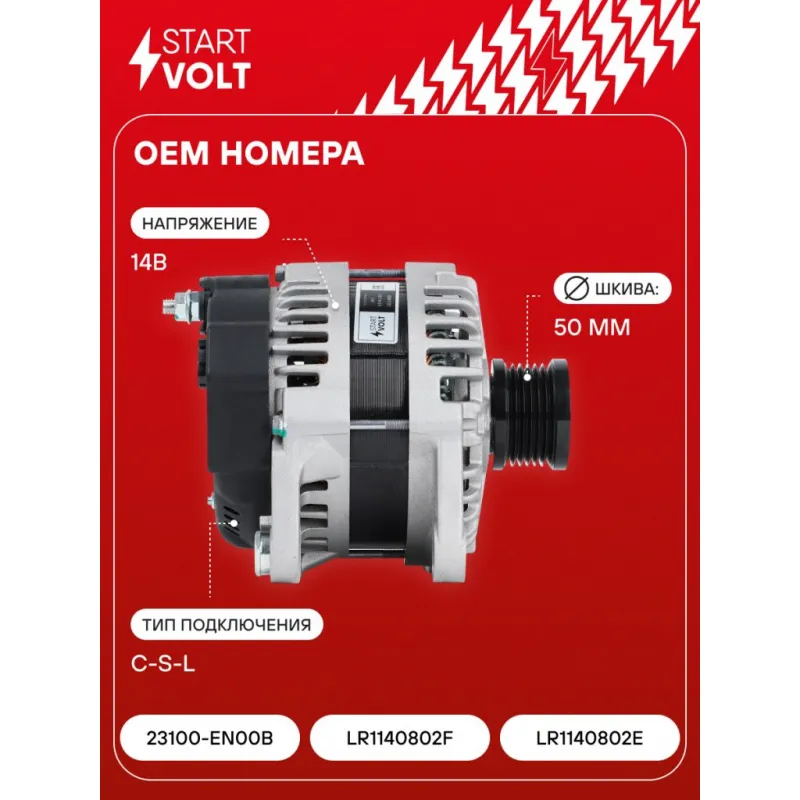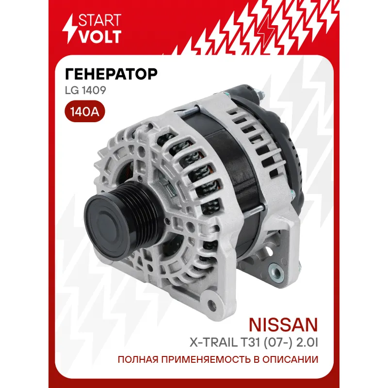 Генератор для автомобилей Nissan X-Trail T31 (07-) 2.0i 140A Описание: Оригинальный генератор STARTVOLT LG 1409 рассчитан на ток 140 А и напряжение 14 В. Изготовлен аналогично оригинальной конструкции. Шкив свободного хода (6PK, диаметр 50 мм) полностью совместим с оригинальными агрегатами. Подходит для автомобилей: NISSAN X-TRAIL.. Если у вас есть вопросы по применяемости, мы всегда готовы помочь вам с подбором по VIN-НОМЕРУ ВАШЕГО АВТОМОБИЛЯ. Преимущества: - Полностью соответствует оригинальным узлам; - Высокоточная сборка с пооперационным контролем качества; - Каждый генератор проходит стендовое тестирование — протокол в комплекте; - Надёжность в любых условиях эксплуатации; - STARTVOLT 15 лет на рынке автоэлектрики — нам доверяют профессионалы; - Гарантия 2 года; - Сертифицирован по стандарту EAC (ЕАЭС) — соответствует требованиям безопасности и качества; Автомобильный генератор в сборе — готов к установке. Отличный выбор для надежной замены штатного генератора. Характеристики: Артикул: LG 1409 OEM номера: 23100-EN00B, LR1140802F, LR1140802E Направление вращения: По часовой стрелке Выходной ток, А: 140 Напряжение, В: 14 Вылет шкива, мм: 38,6 Тип подключения: C-S-L Диаметр шкива, мм: 50 Ременной шкив: с ременным шкивом свободного хода Количество крепежных отверстий: 2 Количество канавок шкива: 6 Комплектация: Индивидуальный технический паспорт изделия (с фирменным ID) - 1 шт Генератор - 1 шт Паспорт изделия/гарантийный талон - 1 шт Гарантия: от 1 года.