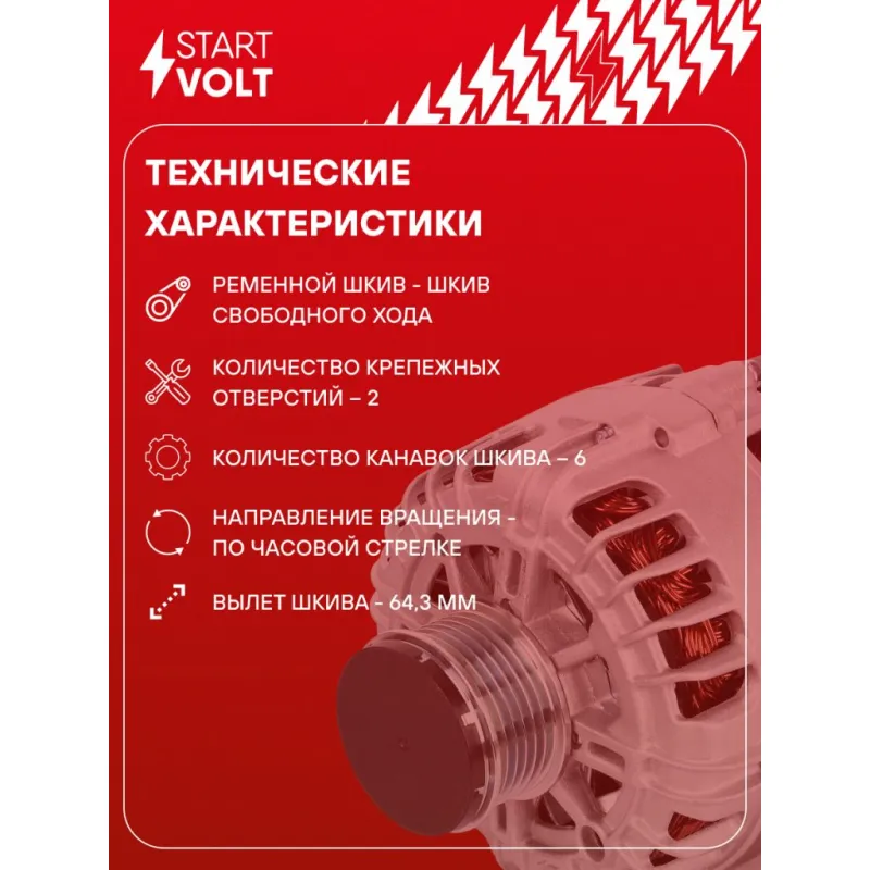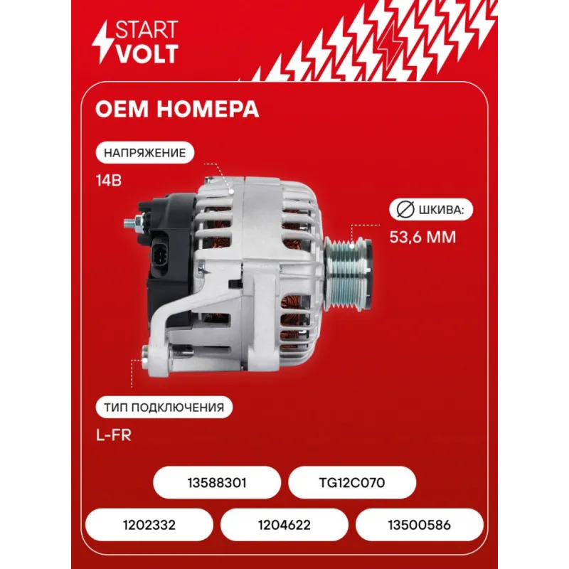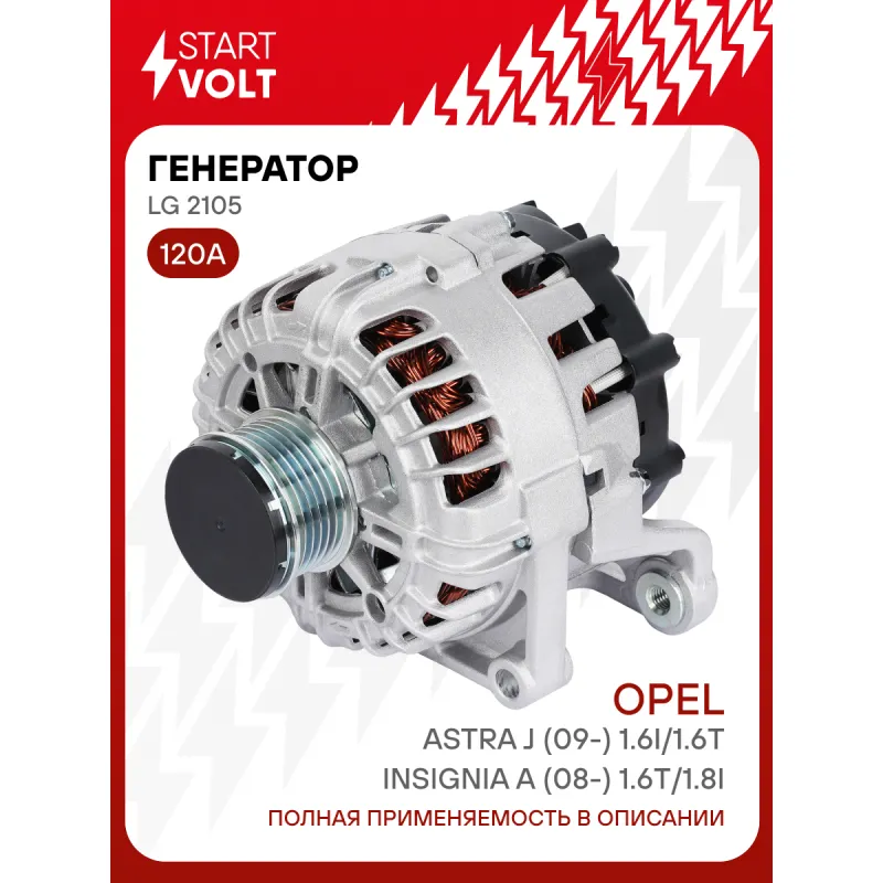 Генератор для автомобилей Opel Astra J (09-) 1.6i/1.6T/Insignia A (08-) 1.6T/1.8i 120A Описание: Оригинальный генератор STARTVOLT LG 2105 рассчитан на ток 120 А и напряжение 14 В. Изготовлен аналогично оригинальной конструкции. Шкив свободного хода (6PK, диаметр 53,6 мм) полностью совместим с оригинальными агрегатами. Подходит для автомобилей: OPEL ASTRA, INSIGNIA, ZAFIRA.. Если у вас есть вопросы по применяемости, мы всегда готовы помочь вам с подбором по VIN-НОМЕРУ ВАШЕГО АВТОМОБИЛЯ. Преимущества: - Полностью соответствует оригинальным узлам; - Высокоточная сборка с пооперационным контролем качества; - Каждый генератор проходит стендовое тестирование — протокол в комплекте; - Надёжность в любых условиях эксплуатации; - STARTVOLT 15 лет на рынке автоэлектрики — нам доверяют профессионалы; - Гарантия 2 года; - Сертифицирован по стандарту EAC (ЕАЭС) — соответствует требованиям безопасности и качества; Автомобильный генератор в сборе — готов к установке. Отличный выбор для надежной замены штатного генератора. Характеристики: Артикул: LG 2105 OEM номера: 1202332, 1204622, 13500586, 13588301, TG12C070 Направление вращения: По часовой стрелке Выходной ток, А: 120 Напряжение, В: 14 Вылет шкива, мм: 64,3 Тип подключения: L-FR Диаметр шкива, мм: 53,6 Ременной шкив: с ременным шкивом свободного хода Количество крепежных отверстий: 2 Количество канавок шкива: 6 Комплектация: Генератор - 1 шт Паспорт изделия/гарантийный талон - 1 шт Индивидуальный технический паспорт изделия (с фирменным ID) - 1 шт Гарантия: от 1 года.