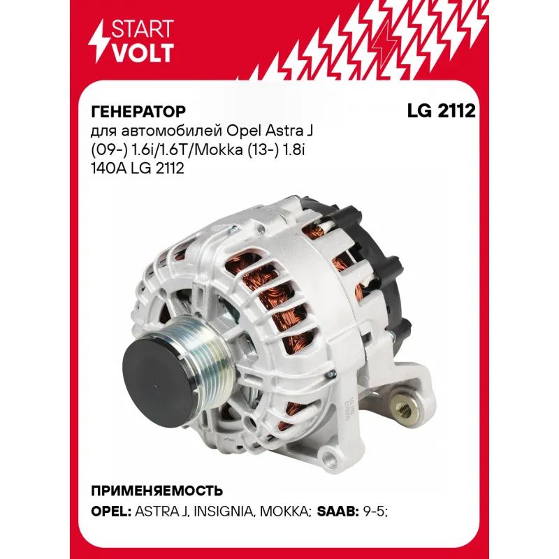 Генератор для автомобилей Opel Astra J (09-) 1.6i/1.6T/Mokka (13-) 1.8i 140A Описание: Оригинальный генератор STARTVOLT LG 2112 рассчитан на ток 140 А и напряжение 14 В. Изготовлен аналогично оригинальной конструкции. Многоручейковый ременной шкив (6PK, диаметр 53,7 мм) полностью совместим с оригинальными агрегатами. Подходит для автомобилей: OPEL ZAFIRA, MOKKA, INSIGNIA, ASTRA, SAAB 9-5.. Если у вас есть вопросы по применяемости, мы всегда готовы помочь вам с подбором по VIN-НОМЕРУ ВАШЕГО АВТОМОБИЛЯ. Преимущества: - Полностью соответствует оригинальным узлам; - Высокоточная сборка с пооперационным контролем качества; - Каждый генератор проходит стендовое тестирование — протокол в комплекте; - Надёжность в любых условиях эксплуатации; - STARTVOLT 15 лет на рынке автоэлектрики — нам доверяют профессионалы; - Гарантия 2 года; - Сертифицирован по стандарту EAC (ЕАЭС) — соответствует требованиям безопасности и качества; Автомобильный генератор в сборе — готов к установке. Отличный выбор для надежной замены штатного генератора. Характеристики: Артикул: LG 2112 OEM номера: 1204621, 13512750, 95524810, 13588303, 13500329, 95515959, 1202329, 1202316, 1204622, 13512748, 13500856, 849237, TG12C069, TG12C175, TG12C070, TG12C072, TG12C179 Направление вращения: по часовой стрелке Выходной ток, А: 140 Напряжение, В: 14 Вылет шкива, мм: 64,3 Тип подключения: L-FR Диаметр шкива, мм: 53,7 Ременной шкив: с многоручейковым ручейковым шкивом Количество крепежных отверстий: 2 Количество канавок шкива: 6 Комплектация: Генератор - 1 шт Индивидуальный технический паспорт изделия (с фирменным ID) - 1 шт Паспорт изделия/гарантийный талон - 1 шт Гарантия: от 1 года.