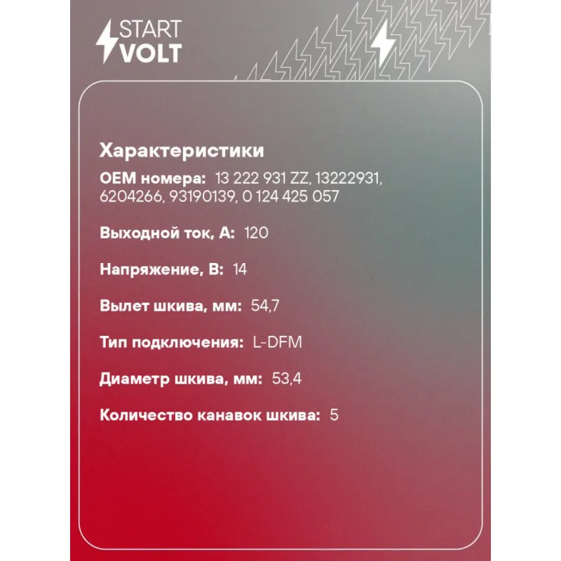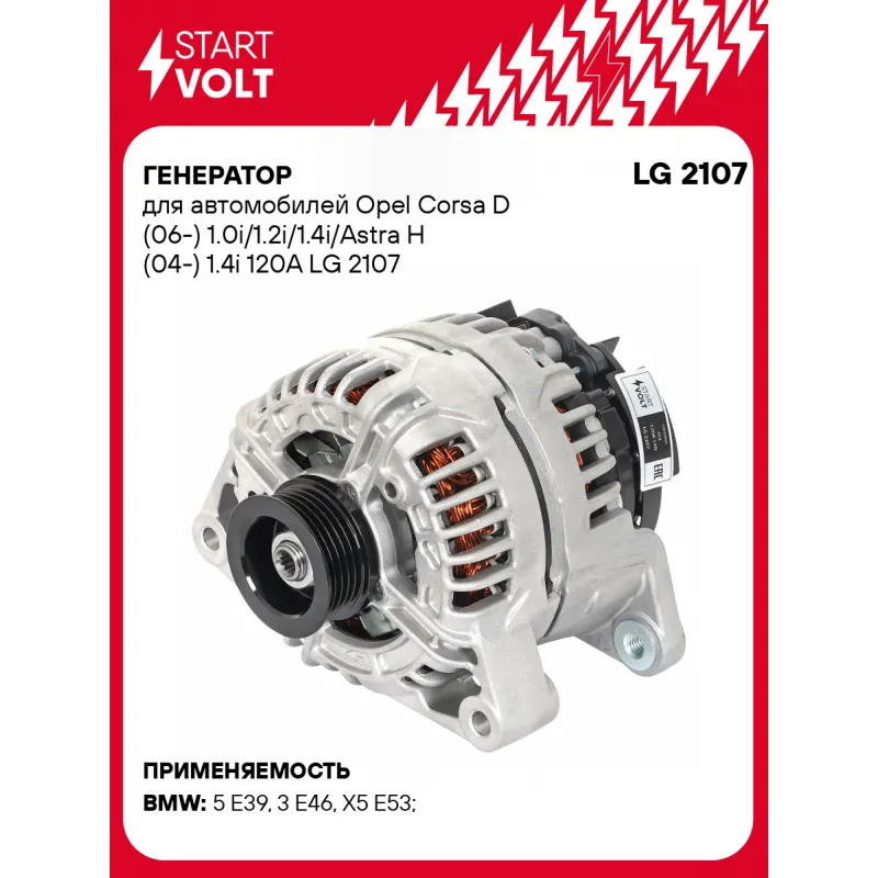 Генератор для автомобилей Opel Corsa D (06-) 1.0i/1.2i/1.4i/Astra H (04-) 1.4i 120A Описание: Оригинальный генератор STARTVOLT LG 2107 рассчитан на ток 120 А и напряжение 14 В. Изготовлен аналогично оригинальной конструкции. Многоручейковый ременной шкив (5PK, диаметр 53,4 мм) полностью совместим с оригинальными агрегатами. Подходит для автомобилей: BMW 5, X5, 3, OPEL CORSA, MERIVA, TIGRA, COMBO, ASTRA.. Если у вас есть вопросы по применяемости, мы всегда готовы помочь вам с подбором по VIN-НОМЕРУ ВАШЕГО АВТОМОБИЛЯ. Преимущества: - Полностью соответствует оригинальным узлам; - Высокоточная сборка с пооперационным контролем качества; - Каждый генератор проходит стендовое тестирование — протокол в комплекте; - Надёжность в любых условиях эксплуатации; - STARTVOLT 15 лет на рынке автоэлектрики — нам доверяют профессионалы; - Гарантия 2 года; - Сертифицирован по стандарту EAC (ЕАЭС) — соответствует требованиям безопасности и качества; Автомобильный генератор в сборе — готов к установке. Отличный выбор для надежной замены штатного генератора. Характеристики: Артикул: LG 2107 OEM номера: 13 222 931 ZZ, 13222931, 6204266, 93190139, 0 124 425 057 Направление вращения: по часовой стрелке Выходной ток, А: 120 Напряжение, В: 14 Вылет шкива, мм: 54,7 Тип подключения: L-DFM Диаметр шкива, мм: 53,4 Ременной шкив: с многоручейковым ручейковым шкивом Количество крепежных отверстий: 2 Количество канавок шкива: 5 Подходит для авто: BMW 5 E39 (95-), 3 E46 (98-), X5 E53 (99-) Для проверки применяемости отправьте VIN автомобиля через вкладку "Есть вопросы о товаре?" Комплектация: Генератор - 1 шт Индивидуальный технический паспорт изделия (с фирменным ID) - 1 шт Паспорт изделия/гарантийный талон - 1 шт Гарантия: от 1 года.