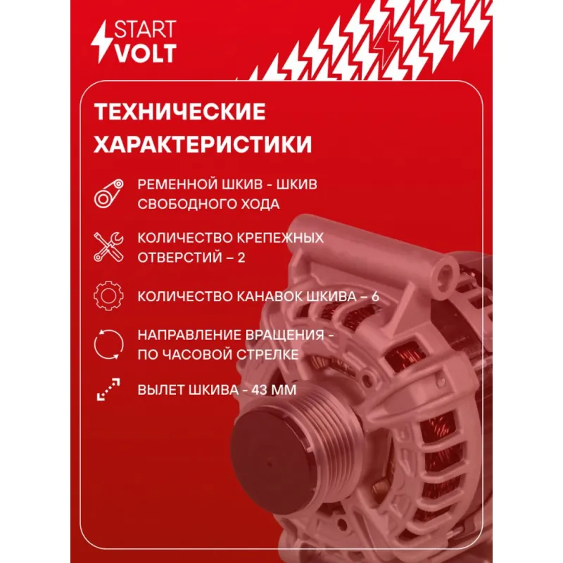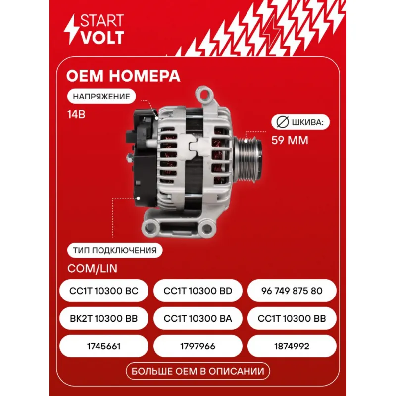 Генератор для автомобилей Peugeot Boxer (11-)/Citroen Jumper (11)/Ford Transit (11-) 2.2TDCi 150A Описание: Оригинальный генератор STARTVOLT LG 1681 рассчитан на ток 150 А и напряжение 14 В. Изготовлен аналогично оригинальной конструкции. Шкив свободного хода (6PK, диаметр 59 мм) полностью совместим с оригинальными агрегатами. Подходит для автомобилей: CITROEN JUMPER, FORD TRANSIT, TRANSIT CUSTOM, PEUGEOT BOXER.. Если у вас есть вопросы по применяемости, мы всегда готовы помочь вам с подбором по VIN-НОМЕРУ ВАШЕГО АВТОМОБИЛЯ. Преимущества: - Полностью соответствует оригинальным узлам; - Высокоточная сборка с пооперационным контролем качества; - Каждый генератор проходит стендовое тестирование — протокол в комплекте; - Надёжность в любых условиях эксплуатации; - STARTVOLT 15 лет на рынке автоэлектрики — нам доверяют профессионалы; - Гарантия 2 года; - Сертифицирован по стандарту EAC (ЕАЭС) — соответствует требованиям безопасности и качества; Автомобильный генератор в сборе — готов к установке. Отличный выбор для надежной замены штатного генератора. Характеристики: Артикул: LG 1681 OEM номера: 96 749 875 80, 1745661, 1797966, 1874992, BK2T 10300 BB, CC1T 10300 BA, CC1T 10300 BB, CC1T 10300 BC, CC1T 10300 BD, 1738112, 1889371, 2073243, 2545291, 1606430480, 1606427480, 0 125 711 131, 0124711058, 0124711132, 0125711001, 0125711058, 0125711101, 0125711102, 0125711132 IDE код: 88 Скорость сигнала: M Напряжение, В: 14 Выходной ток, А: 150 Тип подключения: COM/LIN Диаметр шкива, мм: 59 Ременной шкив: с ременным шкивом свободного хода Количество крепежных отверстий: 2 Количество канавок шкива: 6 Направление вращения: По часовой стрелке Вылет шкива, мм: 43 Сопутствующий товар: Шкивы генераторов с обгонной муфтой: SGP 1680 Комплектация: Паспорт изделия/гарантийный талон - 1 шт Индивидуальный технический паспорт изделия (с фирменным ID) - 1 шт Генератор - 1 шт Гарантия: от 1 года.