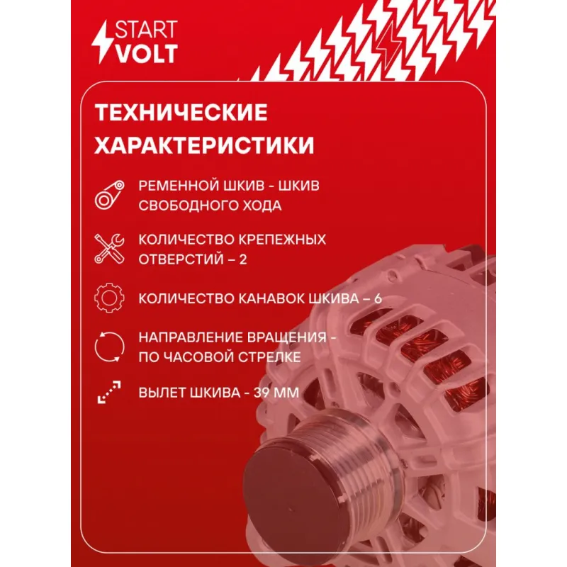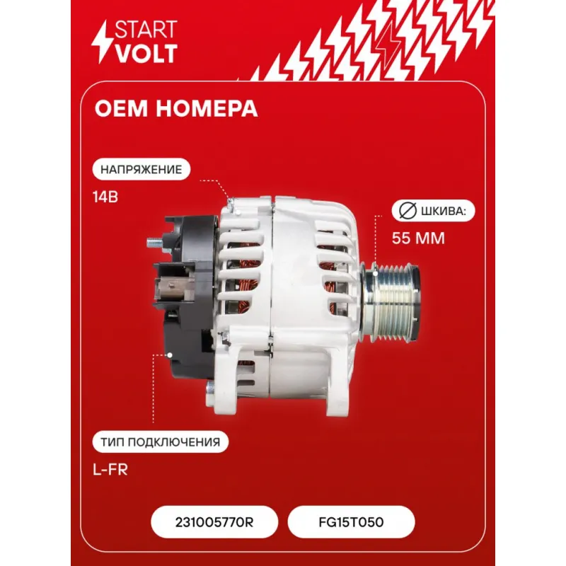 Генератор для автомобилей Renault Duster (10-) 1.5dCi 150A Описание: Оригинальный генератор STARTVOLT LG 0929 рассчитан на ток 150 А и напряжение 14 В. Изготовлен аналогично оригинальной конструкции. Шкив свободного хода (6PK, диаметр 55 мм) полностью совместим с оригинальными агрегатами. Подходит для автомобилей: DACIA DOKKER, DUSTER, RENAULT DUSTER.. Если у вас есть вопросы по применяемости, мы всегда готовы помочь вам с подбором по VIN-НОМЕРУ ВАШЕГО АВТОМОБИЛЯ. Преимущества: - Полностью соответствует оригинальным узлам; - Высокоточная сборка с пооперационным контролем качества; - Каждый генератор проходит стендовое тестирование — протокол в комплекте; - Надёжность в любых условиях эксплуатации; - STARTVOLT 15 лет на рынке автоэлектрики — нам доверяют профессионалы; - Гарантия 2 года; - Сертифицирован по стандарту EAC (ЕАЭС) — соответствует требованиям безопасности и качества; Автомобильный генератор в сборе — готов к установке. Отличный выбор для надежной замены штатного генератора. Характеристики: Артикул: LG 0929 OEM номера: 231005770R, FG15T050 Напряжение, В: 14 Выходной ток, А: 150 Тип подключения: L-FR Диаметр шкива, мм: 55 Ременной шкив: с ременным шкивом свободного хода Количество крепежных отверстий: 2 Количество канавок шкива: 6 Направление вращения: По часовой стрелке Вылет шкива, мм: 39 Сопутствующий товар: Шкивы генераторов с обгонной муфтой: SGP 0902 Подходит для авто: Renault Duster (10-) Для проверки применяемости отправьте VIN автомобиля через вкладку "Есть вопросы о товаре?" Комплектация: Индивидуальный технический паспорт изделия (с фирменным ID) - 1 шт Паспорт изделия/гарантийный талон - 1 шт Генератор - 1 шт Гарантия: от 1 года.