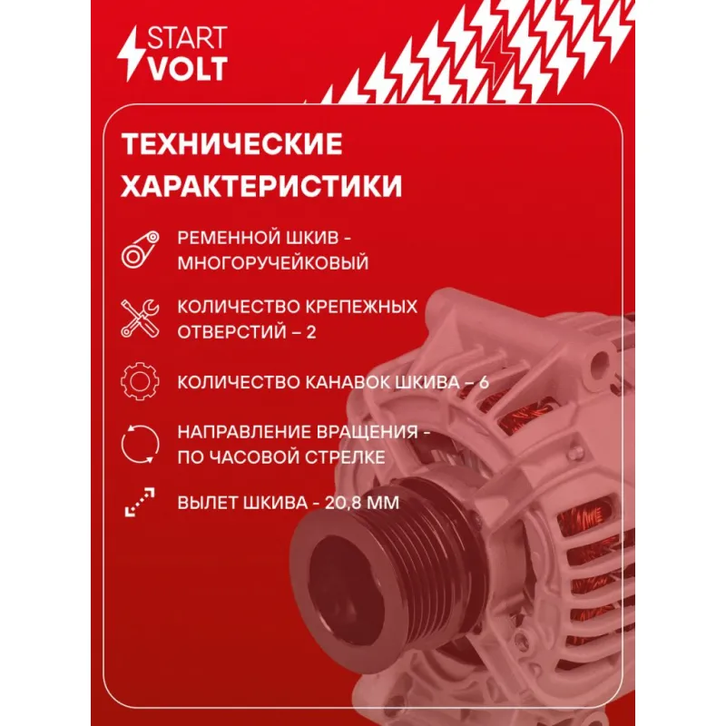Генератор для автомобилей Renault Logan (04-)/Sandero (08-) 1.4i/1.6i 98A (LG 0928) Описание: Оригинальный генератор STARTVOLT LG 0928 рассчитан на ток 98 А и напряжение 14 В. Изготовлен аналогично оригинальной конструкции. с многоручейковым ручейковым шкивом шкив (6PK, диаметр 55 мм) полностью совместим с оригинальными агрегатами. Подходит для автомобилей: DACIA SANDERO, LOGAN, RENAULT LOGAN, SANDERO / STEPWAY.. Если у вас есть вопросы по применяемости, мы всегда готовы помочь вам с подбором по VIN-НОМЕРУ ВАШЕГО АВТОМОБИЛЯ. Преимущества: - Полностью соответствует оригинальным узлам; - Высокоточная сборка с пооперационным контролем качества; - Каждый генератор проходит стендовое тестирование — протокол в комплекте; - Надёжность в любых условиях эксплуатации; - STARTVOLT 15 лет на рынке автоэлектрики — нам доверяют профессионалы; - Гарантия 2 года; - Сертифицирован по стандарту EAC (ЕАЭС) — соответствует требованиям безопасности и качества; Автомобильный генератор в сборе — готов к установке. Отличный выбор для надежной замены штатного генератора. Характеристики: Артикул: LG 0928 OEM номера: 7700101274, 7700421477, 7701476810, 7711134564, 8200030635, 8200103726, 8200727051, 0 124 415 007 Напряжение, В: 14 Выходной ток, А: 98 Тип подключения: L-DFM Диаметр шкива, мм: 55 Ременной шкив: с многоручейковым ручейковым шкивом Количество крепежных отверстий: 2 Количество канавок шкива: 6 Направление вращения: По часовой стрелке Вылет шкива, мм: 20,8 Сопутствующий товар: Регуляторы напряжения генераторов: VRR 0902 Подходит для авто: Renault Logan (04-), Sandero I (09-) Для проверки применяемости отправьте VIN автомобиля через вкладку "Есть вопросы о товаре?" Комплектация: Индивидуальный технический паспорт изделия (с фирменным ID) - 1 шт Паспорт изделия/гарантийный талон - 1 шт Генератор - 1 шт Гарантия: от 1 года.