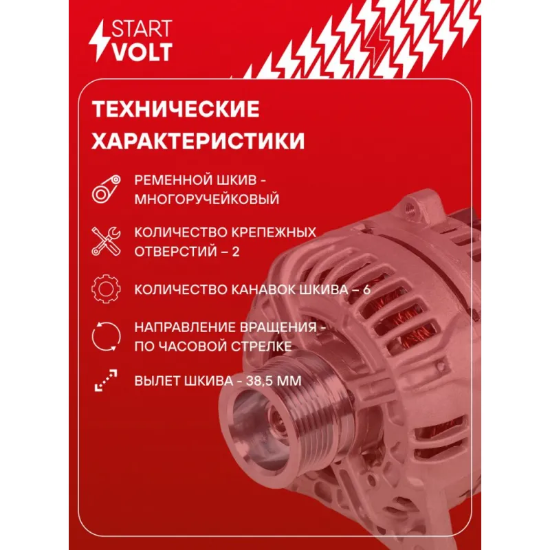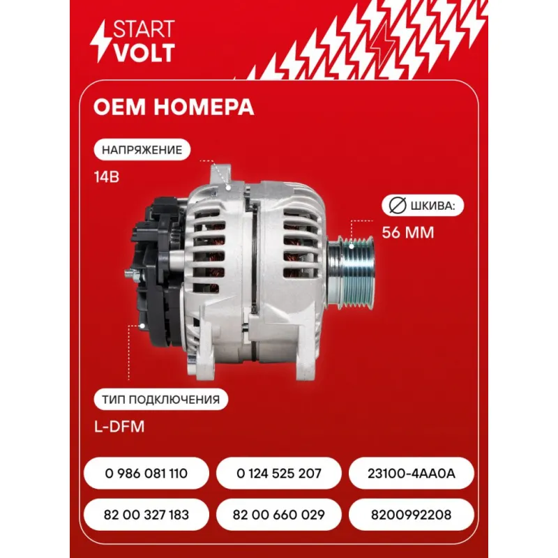 Генератор для автомобилей Renault Logan (06-)/Duster (10-)/Sandero (07-) 1.6i 150A Описание: Оригинальный генератор STARTVOLT LG 0920 рассчитан на ток 150 А и напряжение 14 В. Изготовлен аналогично оригинальной конструкции. с многоручейковым ручейковым шкивом шкив (6PK, диаметр 56 мм) полностью совместим с оригинальными агрегатами. Подходит для автомобилей: DACIA DUSTER, LOGAN, SANDERO, NISSAN BLUEBIRD SYLPHY, RENAULT DUSTER, LOGAN, MEGANE, SANDERO / STEPWAY, SCENIC.. Если у вас есть вопросы по применяемости, мы всегда готовы помочь вам с подбором по VIN-НОМЕРУ ВАШЕГО АВТОМОБИЛЯ. Преимущества: - Полностью соответствует оригинальным узлам; - Высокоточная сборка с пооперационным контролем качества; - Каждый генератор проходит стендовое тестирование — протокол в комплекте; - Надёжность в любых условиях эксплуатации; - STARTVOLT 15 лет на рынке автоэлектрики — нам доверяют профессионалы; - Гарантия 2 года; - Сертифицирован по стандарту EAC (ЕАЭС) — соответствует требованиям безопасности и качества; Автомобильный генератор в сборе — готов к установке. Отличный выбор для надежной замены штатного генератора. Характеристики: Артикул: LG 0920 OEM номера: 82 00 327 183, 82 00 660 029, 8200992208, 0 986 081 110, 0 124 525 207, 23100-4AA0A Напряжение, В: 14 Выходной ток, А: 150 Тип подключения: L-DFM Диаметр шкива, мм: 56 Ременной шкив: с многоручейковым ручейковым шкивом Количество крепежных отверстий: 2 Количество канавок шкива: 6 Направление вращения: По часовой стрелке Вылет шкива, мм: 38,5 Сопутствующий товар: Регуляторы напряжения генераторов: VRR 0902 Комплектация: Паспорт изделия/гарантийный талон - 1 шт Индивидуальный технический паспорт изделия (с фирменным ID) - 1 шт Генератор - 1 шт Гарантия: от 1 года.