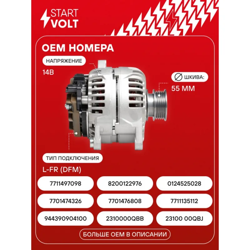 Генератор для автомобилей Renault Megane II (03-) 1.6i/1.4i/Scenic II (05-) 1.5dCi 150A Описание: Оригинальный генератор STARTVOLT LG 0914 рассчитан на ток 150 А и напряжение 14 В. Изготовлен аналогично оригинальной конструкции. Шкив свободного хода (5PK, диаметр 55 мм) полностью совместим с оригинальными агрегатами. Подходит для автомобилей: RENAULT SCENIC, MEGANE, CLIO.. Если у вас есть вопросы по применяемости, мы всегда готовы помочь вам с подбором по VIN-НОМЕРУ ВАШЕГО АВТОМОБИЛЯ. Преимущества: - Полностью соответствует оригинальным узлам; - Высокоточная сборка с пооперационным контролем качества; - Каждый генератор проходит стендовое тестирование — протокол в комплекте; - Надёжность в любых условиях эксплуатации; - STARTVOLT 15 лет на рынке автоэлектрики — нам доверяют профессионалы; - Гарантия 2 года; - Сертифицирован по стандарту EAC (ЕАЭС) — соответствует требованиям безопасности и качества; Автомобильный генератор в сборе — готов к установке. Отличный выбор для надежной замены штатного генератора. Характеристики: Артикул: LG 0914 OEM номера: 944390904100, 2310000QBB, 23100 00QBJ, 7701474326, 7701476808, 7711135112, 7711497098, 8200122976, 0124525028, 0124525528, 0 986 080 290 Напряжение, В: 14 Выходной ток, А: 150 Тип подключения: L-FR (DFM) Диаметр шкива, мм: 55 Ременной шкив: с ременным шкивом свободного хода Количество крепежных отверстий: 2 Количество канавок шкива: 5 Направление вращения: По часовой стрелке Вылет шкива, мм: 43 Сопутствующий товар: Шкивы генераторов с обгонной муфтой: SGP 0914 Подходит для авто: Renault Scenic II (04-), Megane III (08-), Scenic III (09-), Megane II (02-), Megane Scenic II (03-), Megane Scenic II (03-), Megane III (08-), Megane Scenic III (08-) Для проверки применяемости отправьте VIN автомобиля через вкладку "Есть вопросы о товаре?" Комплектация: Генератор - 1 шт Паспорт изделия/гарантийный талон - 1 шт Индивидуальный технический паспорт изделия (с фирменным ID) - 1 шт Гарантия: от 1 года.