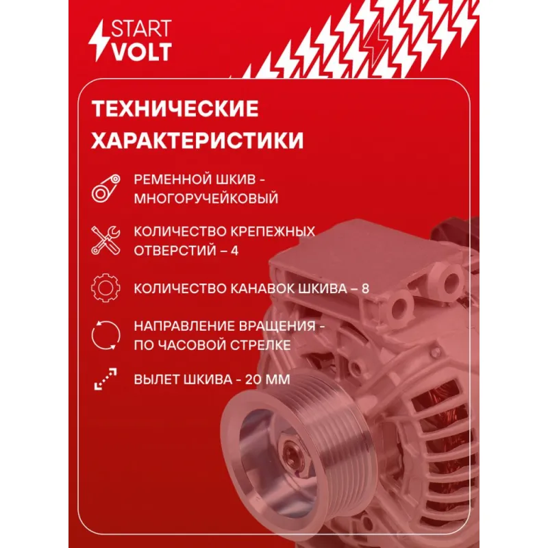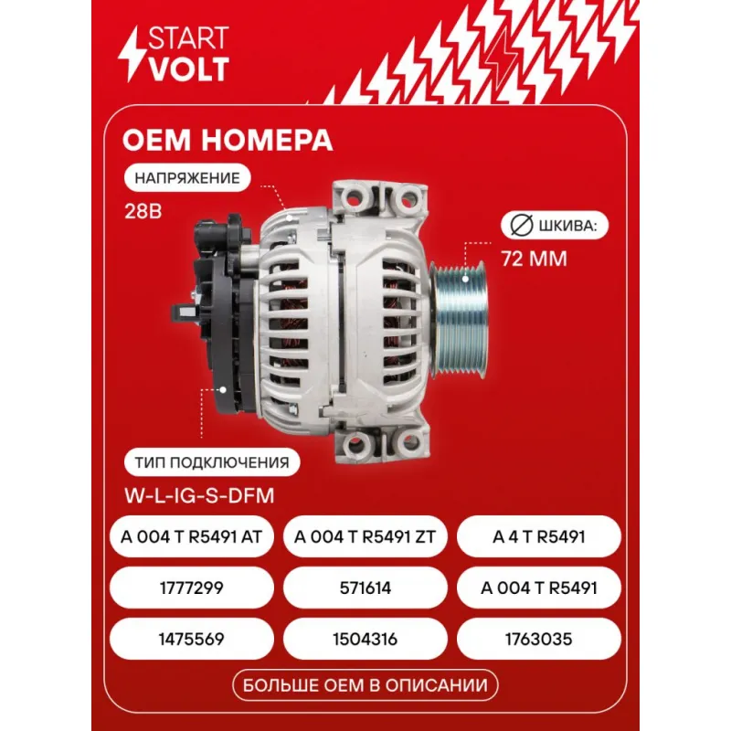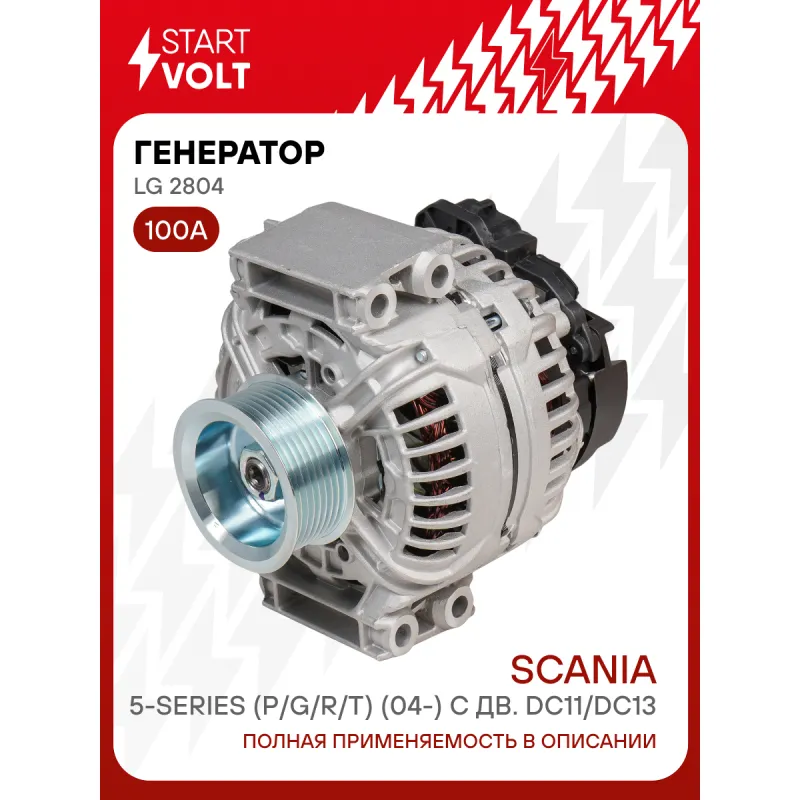 Генератор для автомобилей Scania 5-series (P/G/R/T) (04-) с дв. DC11/DC13 100A Описание: Оригинальный генератор STARTVOLT LG 2804 рассчитан на ток 100 А и напряжение 28 В. Изготовлен аналогично оригинальной конструкции. с многоручейковым ручейковым шкивом шкив (8PK, диаметр 72 мм) полностью совместим с оригинальными агрегатами. Подходит для автомобилей: SCANIA G-SERIES, P,G,R,T-SERIES, P-SERIES, R-SERIES, T-SERIES.. Если у вас есть вопросы по применяемости, мы всегда готовы помочь вам с подбором по VIN-НОМЕРУ ВАШЕГО АВТОМОБИЛЯ. Преимущества: - Полностью соответствует оригинальным узлам; - Высокоточная сборка с пооперационным контролем качества; - Каждый генератор проходит стендовое тестирование — протокол в комплекте; - Надёжность в любых условиях эксплуатации; - STARTVOLT 15 лет на рынке автоэлектрики — нам доверяют профессионалы; - Гарантия 2 года; - Сертифицирован по стандарту EAC (ЕАЭС) — соответствует требованиям безопасности и качества; Автомобильный генератор в сборе — готов к установке. Отличный выбор для надежной замены штатного генератора. Характеристики: Артикул: LG 2804 OEM номера: 1475569, 1504316, 1763035, 1777299, 571614, A 004 T R5491, A 004 T R5491 AT, A 004 T R5491 ZT, A 4 T R5491, A 4 T R5491 AT, A 4 T R5491 ZT, A004TR5491AM, A4TR5491AM, 0 986 047 820, 0124655007, 0124655026, 0571439, 0571614 Напряжение, В: 28 Выходной ток, А: 100 Тип подключения: W-L-IG-S-DFM Диаметр шкива, мм: 72 Ременной шкив: с многоручейковым ручейковым шкивом Количество крепежных отверстий: 4 Количество канавок шкива: 8 Направление вращения: По часовой стрелке Вылет шкива, мм: 20 Подходит для авто: Scania P-serie (04-) Для проверки применяемости отправьте VIN автомобиля через вкладку "Есть вопросы о товаре?" Комплектация: Генератор - 1 шт Паспорт изделия/гарантийный талон - 1 шт Индивидуальный технический паспорт изделия (с фирменным ID) - 1 шт Гарантия: от 1 года.