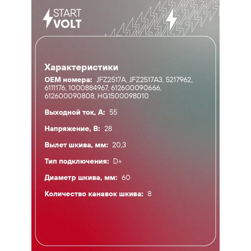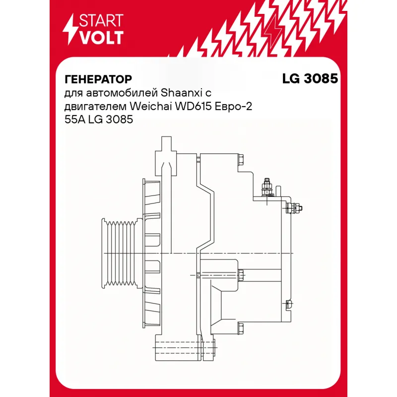 Генератор для автомобилей Shaanxi с двигателем Weichai WD615 Евро-2 55А Характеристики: Артикул: LG 3085 OEM номера: JFZ2517A, JFZ2517A3, 5217962, 6111176, 1000884967, 612600090666, 612600090808, HG1500098010 Направление вращения: по часовой стрелке Выходной ток, А: 55 Напряжение, В: 28 Вылет шкива, мм: 20,3 Тип подключения: D+ Диаметр шкива, мм: 60 Ременной шкив: с многоручейковым ручейковым шкивом Количество крепежных отверстий: 3 Количество канавок шкива: 8 Комплектация: Индивидуальный технический паспорт изделия (с фирменным ID) - 1 шт Генератор - 1 шт Паспорт изделия/гарантийный талон - 1 шт Гарантия: от 1 года.