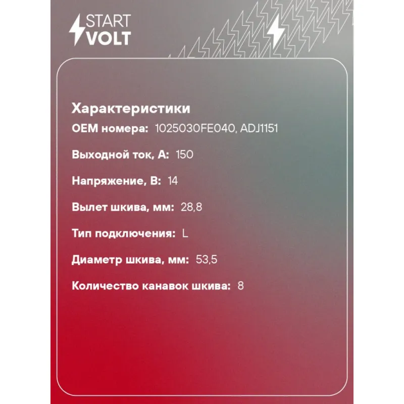 Генератор для автомобилей Sollers Atlant (22-)/JAC N56 (16-) 2.7D [HFC4DE1-1D] Евро-5 150А Описание: Оригинальный генератор STARTVOLT LG 1652 рассчитан на ток 150 А и напряжение 14 В. Изготовлен аналогично оригинальной конструкции. с многоручейковым ручейковым шкивом шкив (8PK, диаметр 53,5 мм) полностью совместим с оригинальными агрегатами. Подходит для автомобилей: JAC N-Series, Sollers ATLANT.. Если у вас есть вопросы по применяемости, мы всегда готовы помочь вам с подбором по VIN-НОМЕРУ ВАШЕГО АВТОМОБИЛЯ. Преимущества: - Полностью соответствует оригинальным узлам; - Высокоточная сборка с пооперационным контролем качества; - Каждый генератор проходит стендовое тестирование — протокол в комплекте; - Надёжность в любых условиях эксплуатации; - STARTVOLT 15 лет на рынке автоэлектрики — нам доверяют профессионалы; - Гарантия 2 года; - Сертифицирован по стандарту EAC (ЕАЭС) — соответствует требованиям безопасности и качества; Автомобильный генератор в сборе — готов к установке. Отличный выбор для надежной замены штатного генератора. Характеристики: Артикул: LG 1652 OEM номера: 1025030FE040, ADJ1151 Направление вращения: По часовой стрелке Выходной ток, А: 150 Напряжение, В: 14 Вылет шкива, мм: 28,8 Тип подключения: L Диаметр шкива, мм: 53,5 Ременной шкив: с многоручейковым ручейковым шкивом Количество крепежных отверстий: 2 Количество канавок шкива: 8 Комплектация: Генератор - 1 шт Индивидуальный технический паспорт изделия (с фирменным ID) - 1 шт Паспорт изделия/гарантийный талон - 1 шт Гарантия: от 1 года.