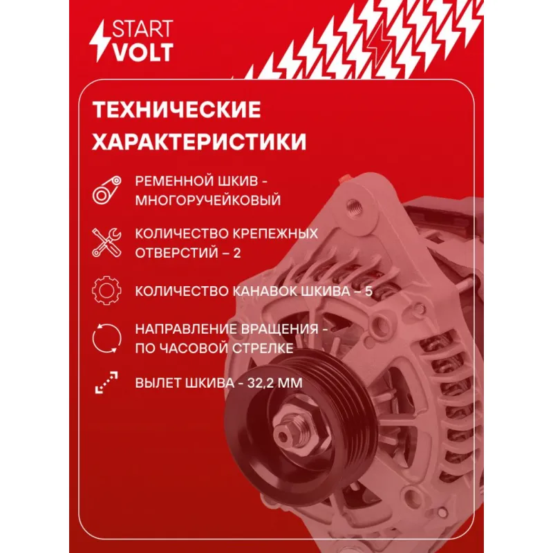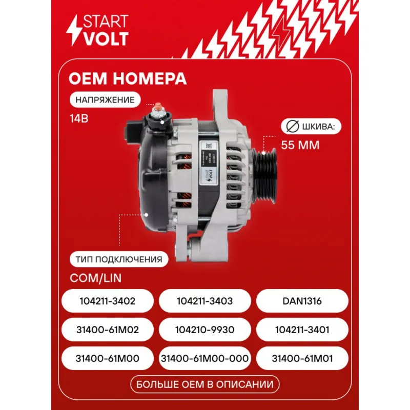 Генератор для автомобилей Suzuki Grand Vitara (15-)/SX4 (13-) 1.6i 100A Описание: Оригинальный генератор STARTVOLT LG 2457 рассчитан на ток 100 А и напряжение 14 В. Изготовлен аналогично оригинальной конструкции. с многоручейковым ручейковым шкивом шкив (5PK, диаметр 55 мм) полностью совместим с оригинальными агрегатами. Подходит для автомобилей: SUZUKI SX4, VITARA.. Если у вас есть вопросы по применяемости, мы всегда готовы помочь вам с подбором по VIN-НОМЕРУ ВАШЕГО АВТОМОБИЛЯ. Преимущества: - Полностью соответствует оригинальным узлам; - Высокоточная сборка с пооперационным контролем качества; - Каждый генератор проходит стендовое тестирование — протокол в комплекте; - Надёжность в любых условиях эксплуатации; - STARTVOLT 15 лет на рынке автоэлектрики — нам доверяют профессионалы; - Гарантия 2 года; - Сертифицирован по стандарту EAC (ЕАЭС) — соответствует требованиям безопасности и качества; Автомобильный генератор в сборе — готов к установке. Отличный выбор для надежной замены штатного генератора. Характеристики: Артикул: LG 2457 OEM номера: 31400-61M00, 31400-61M00-000, 31400-61M01, 31400-61M02, 104210-9930, 104211-3401, 104211-3402, 104211-3403, DAN1316, 104211-3400 Направление вращения: По часовой стрелке Выходной ток, А: 100 Напряжение, В: 14 Вылет шкива, мм: 32,2 Тип подключения: COM/LIN Диаметр шкива, мм: 55 Ременной шкив: с многоручейковым ручейковым шкивом Количество крепежных отверстий: 2 Количество канавок шкива: 5 IDE код: 244 Скорость сигнала: H Комплектация: Индивидуальный технический паспорт изделия (с фирменным ID) - 1 шт Паспорт изделия/гарантийный талон - 1 шт Генератор - 1 шт Гарантия: от 1 года.
