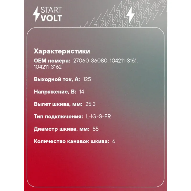 Генератор для автомобилей Toyota Camry V50 (11-)/RAV4 (15-) 2.5i 125A Характеристики: Артикул: LG 1947 OEM номера: 27060-36080, 104211-3161, 104211-3162 Направление вращения: по часовой стрелке Выходной ток, А: 125 Напряжение, В: 14 Вылет шкива, мм: 25,3 Тип подключения: L-IG-S-FR Диаметр шкива, мм: 55 Ременной шкив: с ременным ... Читать полностью →