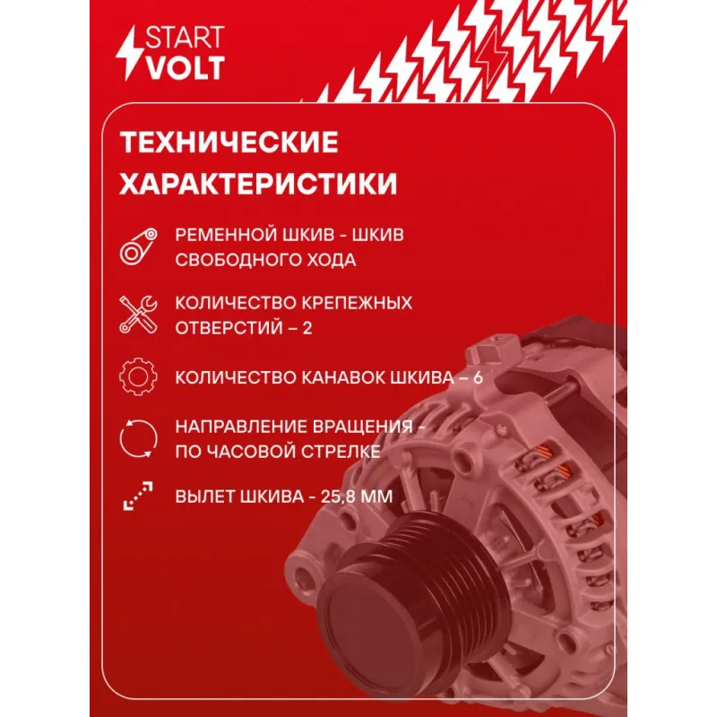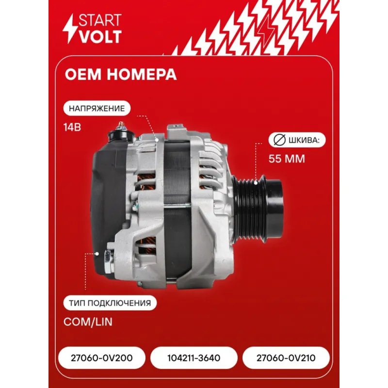 Генератор для автомобилей Toyota Camry V55 (15-)/Camry V70 (18-) 2.0i 120A Описание: Оригинальный генератор STARTVOLT LG 1923 рассчитан на ток 120 А и напряжение 14 В. Изготовлен аналогично оригинальной конструкции. Шкив свободного хода (6PK, диаметр 55 мм) полностью совместим с оригинальными агрегатами. Подходит для автомобилей: TOYOTA CAMRY.. Если у вас есть вопросы по применяемости, мы всегда готовы помочь вам с подбором по VIN-НОМЕРУ ВАШЕГО АВТОМОБИЛЯ. Преимущества: - Полностью соответствует оригинальным узлам; - Высокоточная сборка с пооперационным контролем качества; - Каждый генератор проходит стендовое тестирование — протокол в комплекте; - Надёжность в любых условиях эксплуатации; - STARTVOLT 15 лет на рынке автоэлектрики — нам доверяют профессионалы; - Гарантия 2 года; - Сертифицирован по стандарту EAC (ЕАЭС) — соответствует требованиям безопасности и качества; Автомобильный генератор в сборе — готов к установке. Отличный выбор для надежной замены штатного генератора. Характеристики: Артикул: LG 1923 OEM номера: 27060-0V200, 104211-3640, 27060-0V210 IDE код: 9 Скорость сигнала: LMH Напряжение, В: 14 Выходной ток, А: 120 Тип подключения: COM/LIN Диаметр шкива, мм: 55 Ременной шкив: с ременным шкивом свободного хода Количество крепежных отверстий: 2 Количество канавок шкива: 6 Направление вращения: По часовой стрелке Вылет шкива, мм: 25,8 Сопутствующий товар: Шкивы генераторов с обгонной муфтой: SGP 1904 Подходит для авто: Toyota Camry (11-) Для проверки применяемости отправьте VIN автомобиля через вкладку "Есть вопросы о товаре?" Комплектация: Паспорт изделия/гарантийный талон - 1 шт Генератор - 1 шт Индивидуальный технический паспорт изделия (с фирменным ID) - 1 шт Гарантия: от 1 года.