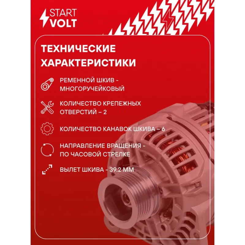 Генератор для автомобилей VAG Octavia A5 (04-)/Jetta III (04-)/Golf V (04-) 1.6i 110A Описание: Оригинальный генератор STARTVOLT LG 1820 рассчитан на ток 110 А и напряжение 14 В. Изготовлен аналогично оригинальной конструкции. с многоручейковым ручейковым шкивом шкив (6PK, диаметр 56 мм) полностью совместим с оригинальными агрегатами. Подходит для автомобилей: AUDI A3, SEAT ALTEA, LEON, TOLEDO, SKODA OCTAVIA, ROOMSTER, VW CADDY, EOS, GOLF PLUS, GOLF, JETTA, T5, PASSAT, TOURAN.. Если у вас есть вопросы по применяемости, мы всегда готовы помочь вам с подбором по VIN-НОМЕРУ ВАШЕГО АВТОМОБИЛЯ. Преимущества: - Полностью соответствует оригинальным узлам; - Высокоточная сборка с пооперационным контролем качества; - Каждый генератор проходит стендовое тестирование — протокол в комплекте; - Надёжность в любых условиях эксплуатации; - STARTVOLT 15 лет на рынке автоэлектрики — нам доверяют профессионалы; - Гарантия 2 года; - Сертифицирован по стандарту EAC (ЕАЭС) — соответствует требованиям безопасности и качества; Автомобильный генератор в сборе — готов к установке. Отличный выбор для надежной замены штатного генератора. Характеристики: Артикул: LG 1820 OEM номера: 06F903023G, 06F903023GX, 0 124 325 091, 06F903023B, 0 986 045 330 Напряжение, В: 14 Выходной ток, А: 110 Тип подключения: L-DFM Диаметр шкива, мм: 56 Ременной шкив: с многоручейковым ручейковым шкивом Количество крепежных отверстий: 2 Количество канавок шкива: 6 Направление вращения: По часовой стрелке Вылет шкива, мм: 39,2 Сопутствующий товар: Регуляторы напряжения генераторов: VRR 1650 Комплектация: Индивидуальный технический паспорт изделия (с фирменным ID) - 1 шт Генератор - 1 шт Паспорт изделия/гарантийный талон - 1 шт Гарантия: от 1 года.