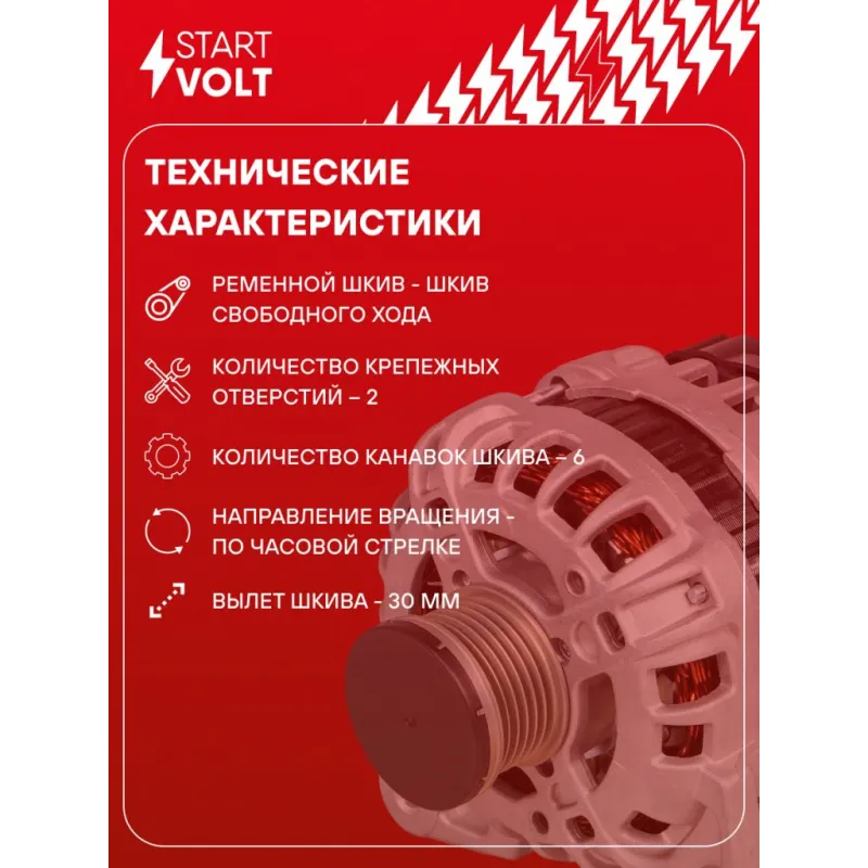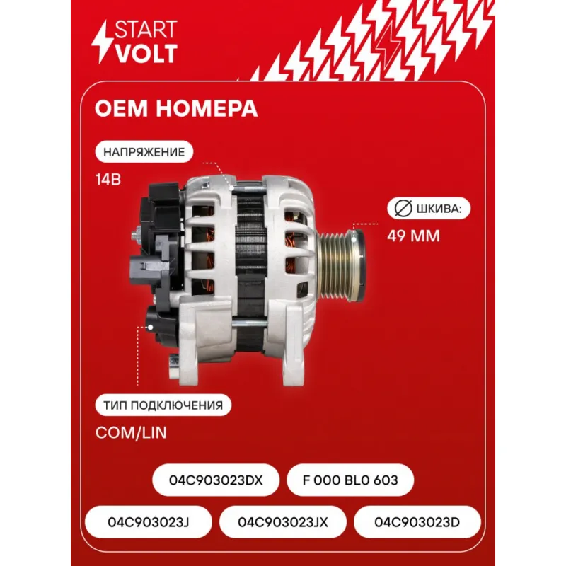 Генератор для автомобилей VAG Polo (20-)/Octavia A8 (20-) 1.6i 110A Описание: Оригинальный генератор STARTVOLT LG 1842 рассчитан на ток 110 А и напряжение 14 В. Изготовлен аналогично оригинальной конструкции. Шкив свободного хода (6PK, диаметр 49 мм) полностью совместим с оригинальными агрегатами. Подходит для автомобилей: SEAT TOLEDO, Mii, IBIZA, SKODA SCALA, RAPID, OCTAVIA, KAROQ, KAMIQ, FABIA, CITIGO, VW UP, POLO.. Если у вас есть вопросы по применяемости, мы всегда готовы помочь вам с подбором по VIN-НОМЕРУ ВАШЕГО АВТОМОБИЛЯ. Преимущества: - Полностью соответствует оригинальным узлам; - Высокоточная сборка с пооперационным контролем качества; - Каждый генератор проходит стендовое тестирование — протокол в комплекте; - Надёжность в любых условиях эксплуатации; - STARTVOLT 15 лет на рынке автоэлектрики — нам доверяют профессионалы; - Гарантия 2 года; - Сертифицирован по стандарту EAC (ЕАЭС) — соответствует требованиям безопасности и качества; Автомобильный генератор в сборе — готов к установке. Отличный выбор для надежной замены штатного генератора. Характеристики: Артикул: LG 1842 OEM номера: 04C903023J, 04C903023JX, 04C903023D, 04C903023DX, F 000 BL0 603 IDE код: 16 Скорость сигнала: H Напряжение, В: 14 Выходной ток, А: 110 Тип подключения: COM/LIN Диаметр шкива, мм: 49 Ременной шкив: с ременным шкивом свободного хода Количество крепежных отверстий: 2 Количество канавок шкива: 6 Направление вращения: По часовой стрелке Вылет шкива, мм: 30 Сопутствующий товар: Шкивы генераторов с обгонной муфтой: SGP 1824 Комплектация: Индивидуальный технический паспорт изделия (с фирменным ID) - 1 шт Паспорт изделия/гарантийный талон - 1 шт Генератор - 1 шт Гарантия: от 1 года.