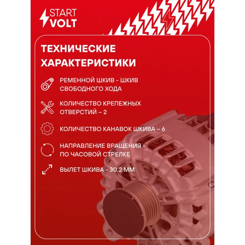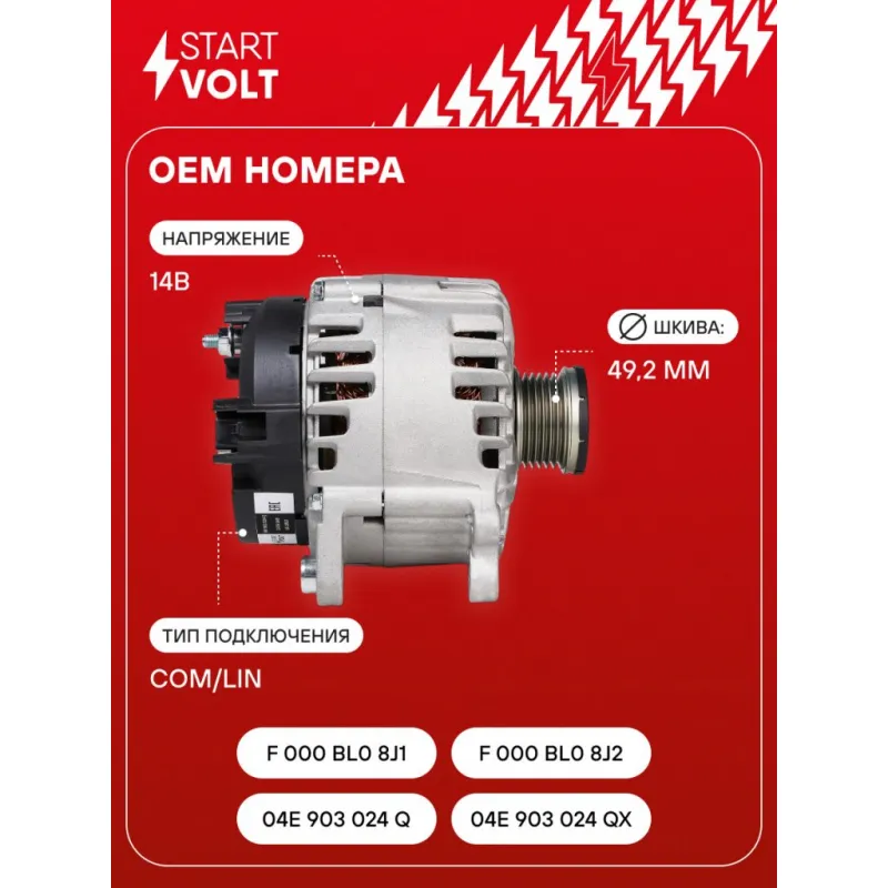 Генератор для автомобилей VAG Polo (20-)/Octavia A8 (20-) 1.6i 140A Описание: Оригинальный генератор STARTVOLT LG 1827 рассчитан на ток 140 А и напряжение 14 В. Изготовлен аналогично оригинальной конструкции. Шкив свободного хода (6PK, диаметр 49,2 мм) полностью совместим с оригинальными агрегатами. Подходит для автомобилей: SEAT IBIZA, VW POLO, GOLF, CADDY.. Если у вас есть вопросы по применяемости, мы всегда готовы помочь вам с подбором по VIN-НОМЕРУ ВАШЕГО АВТОМОБИЛЯ. Преимущества: - Полностью соответствует оригинальным узлам; - Высокоточная сборка с пооперационным контролем качества; - Каждый генератор проходит стендовое тестирование — протокол в комплекте; - Надёжность в любых условиях эксплуатации; - STARTVOLT 15 лет на рынке автоэлектрики — нам доверяют профессионалы; - Гарантия 2 года; - Сертифицирован по стандарту EAC (ЕАЭС) — соответствует требованиям безопасности и качества; Автомобильный генератор в сборе — готов к установке. Отличный выбор для надежной замены штатного генератора. Характеристики: Артикул: LG 1827 OEM номера: 04E 903 024 Q, 04E 903 024 QX, F 000 BL0 8J1, F 000 BL0 8J2 IDE код: 24 Скорость сигнала: LMH Напряжение, В: 14 Выходной ток, А: 140 Тип подключения: COM/LIN Диаметр шкива, мм: 49,2 Ременной шкив: с ременным шкивом свободного хода Количество крепежных отверстий: 2 Количество канавок шкива: 6 Направление вращения: По часовой стрелке Вылет шкива, мм: 30,2 Сопутствующий товар: Регуляторы напряжения генераторов: VRR 1823 Сопутствующий товар: Шкивы генераторов с обгонной муфтой: SGP 1814 Подходит для авто: Volkswagen Polo (RUS) (20-) Для проверки применяемости отправьте VIN автомобиля через вкладку "Есть вопросы о товаре?" Комплектация: Индивидуальный технический паспорт изделия (с фирменным ID) - 1 шт Генератор - 1 шт Паспорт изделия/гарантийный талон - 1 шт Гарантия: от 1 года.