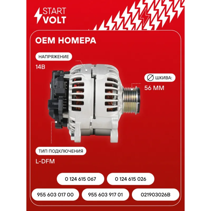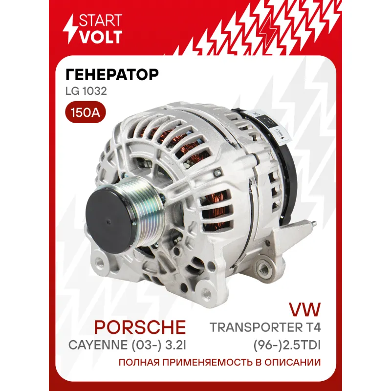 Генератор для автомобилей VAG Transporter T4 (96-) 2.5TDI/Cayenne (03-) 3.2i 150A Описание: Оригинальный генератор STARTVOLT LG 1032 рассчитан на ток 150 А и напряжение 14 В. Изготовлен аналогично оригинальной конструкции. Шкив свободного хода (7PK, диаметр 56 мм) полностью совместим с оригинальными агрегатами. Подходит для автомобилей: CHRYSLER SEBRING, DODGE AVENGER, CALIBER, JOURNEY, FORD GALAXY, JEEP PATRIOT, PORSCHE CAYENNE, SEAT ALHAMBRA, VW T5, SHARAN, TOUAREG, T4.. Если у вас есть вопросы по применяемости, мы всегда готовы помочь вам с подбором по VIN-НОМЕРУ ВАШЕГО АВТОМОБИЛЯ. Преимущества: - Полностью соответствует оригинальным узлам; - Высокоточная сборка с пооперационным контролем качества; - Каждый генератор проходит стендовое тестирование — протокол в комплекте; - Надёжность в любых условиях эксплуатации; - STARTVOLT 15 лет на рынке автоэлектрики — нам доверяют профессионалы; - Гарантия 2 года; - Сертифицирован по стандарту EAC (ЕАЭС) — соответствует требованиям безопасности и качества; Автомобильный генератор в сборе — готов к установке. Отличный выбор для надежной замены штатного генератора. Характеристики: Артикул: LG 1032 OEM номера: 955 603 017 00, 955 603 917 01, 021903026B, 0 124 615 067, 0 124 615 026 Напряжение, В: 14 Выходной ток, А: 150 Тип подключения: L-DFM Диаметр шкива, мм: 56 Ременной шкив: с ременным шкивом свободного хода Количество крепежных отверстий: 2 Количество канавок шкива: 7 Направление вращения: По часовой стрелке Вылет шкива, мм: 30 Сопутствующий товар: Регуляторы напряжения генераторов: VRR 1650 Сопутствующий товар: Шкивы генераторов с обгонной муфтой: SGP 1032 Подходит для авто: Porsche Cayenne (02-) Volkswagen Touareg (02-), Transporter T5 (03-) Для проверки применяемости отправьте VIN автомобиля через вкладку "Есть вопросы о товаре?" Комплектация: Индивидуальный технический паспорт изделия (с фирменным ID) - 1 шт Генератор - 1 шт Паспорт изделия/гарантийный талон - 1 шт Гарантия: от 1 года.