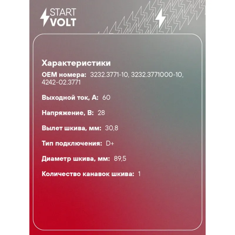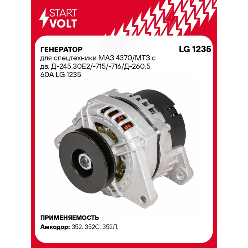 Генератор для спецтехники МАЗ 4370/МТЗ с дв. Д-245.30Е2/-715/-716/Д-260.5 60A Описание: Оригинальный генератор STARTVOLT LG 1235 рассчитан на ток 60 А и напряжение 28 В. Изготовлен аналогично оригинальной конструкции. с ремённым шкивом шкив (диаметр 89,5 мм) полностью совместим с оригинальными агрегатами. Подходит для автомобилей: Амкодор 352С, 352, 352Л.. Если у вас есть вопросы по применяемости, мы всегда готовы помочь вам с подбором по VIN-НОМЕРУ ВАШЕГО АВТОМОБИЛЯ. Преимущества: - Полностью соответствует оригинальным узлам; - Высокоточная сборка с пооперационным контролем качества; - Каждый генератор проходит стендовое тестирование — протокол в комплекте; - Надёжность в любых условиях эксплуатации; - STARTVOLT 15 лет на рынке автоэлектрики — нам доверяют профессионалы; - Гарантия 2 года; - Сертифицирован по стандарту EAC (ЕАЭС) — соответствует требованиям безопасности и качества; Автомобильный генератор в сборе — готов к установке. Отличный выбор для надежной замены штатного генератора. Характеристики: Артикул: LG 1235 OEM номера: 3232.3771-10, 3232.3771000-10, 4242-02.3771 Напряжение, В: 28 Выходной ток, А: 60 Тип подключения: D+ Диаметр шкива, мм: 89,5 Ременной шкив: с ремённым шкивом Количество крепежных отверстий: 2 Количество канавок шкива: 1 Направление вращения: По часовой стрелке Вылет шкива, мм: 30,8 Подходит для авто: Амкодор 352, 352С, 352Л Для проверки применяемости отправьте VIN автомобиля через вкладку "Есть вопросы о товаре?" Комплектация: Генератор - 1 шт Паспорт изделия/гарантийный талон - 1 шт Индивидуальный технический паспорт изделия (с фирменным ID) - 1 шт Гарантия: от 1 года.
