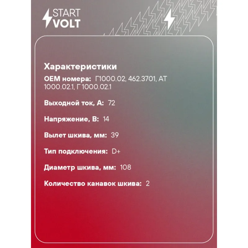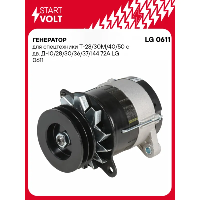Генератор для спецтехники Т-28/30М/40/50 с дв. Д-10/28/30/36/37/144 72А Характеристики: Артикул: LG 0611 OEM номера: Г1000.02, 462.3701, АТ 1000.02.1, Г 1000.02.1 Направление вращения: По часовой стрелке Выходной ток, А: 72 Напряжение, В: 14 Вылет шкива, мм: 39 Тип подключения: D+ Диаметр шкива, мм: 108 Ременной шкив: с ремённым... Читать полностью →