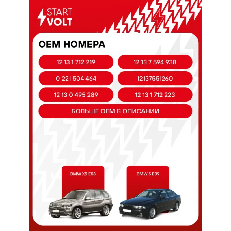 Катушка зажигания для автомобилей BMW X5 Е53 (00-)/X1 Е84 (10-)/5 Е39 (00-)/3 Е46 (01-) 1.6i-3.2i Характеристики: Артикул: SC 2622 OEM номера: 12 13 1 712 219, 12 13 7 594 938, LV CL8 05, 0 221 504 464, 133825, 2503825, 12137551260, 12 13 0 495 289, 12 13 1 712 223, 12 13 8 657 273, 12135A06753 Количество контактов: 3 Подходящий разъем AIRLINE:: AECC078 Выходное напряжение, кВ: 34 Номинальное напряжение, В: 12 Наличие коммутатора: Отсутствует Первичное сопротивление, Ом: 0,55 Первичная индуктивность, мН: 4,1 Энергия искры, мДж: 48 Подходит для авто: BMW 3 E46 (98-), 5 E39 (95-), 5 E60 (03-), 7 E65/E66 (01-), X3 E83 (04-), X5 E53 (99-), Z3 M E36 (96-), Z4 E85 (05-) Для проверки применяемости отправьте VIN автомобиля через вкладку "Есть вопросы о товаре?" Комплектация: Катушка зажигания - 1 шт Паспорт изделия/гарантийный талон - 1 шт Гарантия: от 1 года.