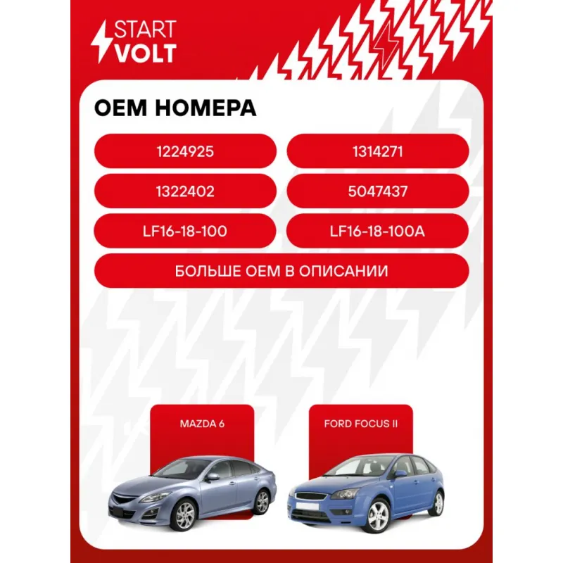 Катушка зажигания для автомобилей Ford Focus II (04-)/Mazda 6 (07-)/Volvo S40 (04-) 1.8i/2.0i/2.3i Характеристики: Артикул: SC 1080 OEM номера: 1224925, 1314271, 1322402, 5 047 437, LF16-18-100, LF16-18-100A, LF16-18-100B, 30711786, 4M5E12A366AA, LF16-18-1, 1578771, 4M5G-12A366-BA, 4M5G-12A366-BB, 4M5G-12A366-BC, 4M5G-12A366-BD, 4MG1 2A366 BB, 31375294, 8694741, 0 221 504 702, 1338-52 Количество контактов: 2 Подходящий разъем AIRLINE:: AECC261, AECC076 Выходное напряжение, кВ: 25 Номинальное напряжение, В: 12 Наличие коммутатора: Отсутствует Первичное сопротивление, Ом: 0,57 Вторичное сопротивление, кОм: 5,9 Первичная индуктивность, мН: 1,32 Вторичная индуктивность, Н: 49,7 Энергия искры, мДж: 63 Сопутствующий товар: Наконечники катушек зажигания: STC 1080 Подходит для авто: Ford Focus C-Max (03-), Focus II (05-), Mondeo IV (07-), S-Max (06-), Galaxy II (06-) Mazda 3 (03-), 3 (09-), 3 (03-) Volvo C30 (06-), S80 II (06-), S40 (04-) Для проверки применяемости отправьте VIN автомобиля через вкладку "Есть вопросы о товаре?" Комплектация: Паспорт изделия/гарантийный талон - 1 шт Катушка зажигания - 1 шт Гарантия: от 1 года.