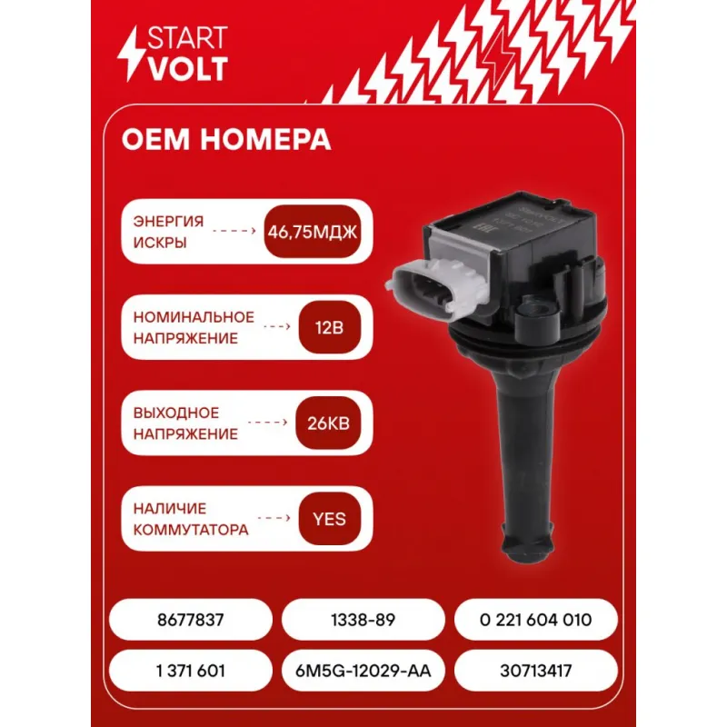 Катушка зажигания для автомобилей Volvo S60 (04-)/S40 (04-)/Ford Kuga (08-) 2.5i/2.0i Характеристики: Артикул: SC 1010 OEM номера: 1 371 601, 6M5G-12029-AA, 30713417, 8677837, 1338-89, 0 221 604 010 Количество контактов: 4 Подходящий разъем AIRLINE:: AECC158 Выходное напряжение, кВ: 26 Номинальное напряжение, В: 12 Наличие коммутатора: Есть Энергия искры, мДж: 46,75 Подходит для авто: Volvo C30 (06-), C70 (06-), S40 (04-), S60 (00-), S80 (98-), S80 II (06-), V50 (04-), V70 (00-), V70 (07-) Ford Focus II (05-), Kuga (08-), Mondeo IV (07-), S-Max (06-) Для проверки применяемости отправьте VIN автомобиля через вкладку "Есть вопросы о товаре?" Комплектация: Катушка зажигания - 1 шт Паспорт изделия/гарантийный талон - 1 шт Гарантия: от 1 года.