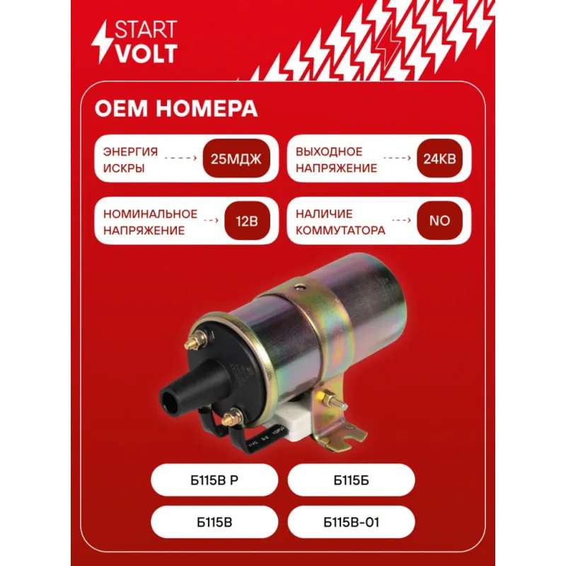 Катушка зажигания для автомобилей ГАЗ 24/52/УАЗ 452/469 с дв. 402 Характеристики: Артикул: SC 0313 OEM номера: Б115В, Б115В-01, Б115В Р, Б115Б Количество контактов: M5/M5/M4 Выходное напряжение, кВ: 24 Номинальное напряжение, В: 12 Наличие коммутатора: отсутсвует Первичное сопротивление, Ом: 1,6 Вторичное сопротивление, кОм: 8,2 Первичная индуктивность, мН: 6,6 Вторичная индуктивность, Н: 39 Энергия искры, мДж: 25 Комплектация: Катушка зажигания - 1 шт Паспорт изделия/гарантийный талон - 1 шт Гарантия: от 1 года.