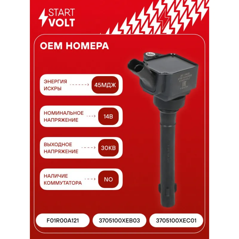 Катушка зажигания для автомобилей Haval F7/F7x (19-) 1.5T Характеристики: Артикул: SC 0400 OEM номера: F01R00A121, 3705100XEB03, 3705100XEC01 Номинальное напряжение, В: 14 Количество контактов: 3 Выходное напряжение, кВ: 30 Наличие коммутатора: no Первичное сопротивление, Ом: - Вторичное сопротивление, кОм: - Первичная индуктивность, мН: - Вторичная индуктивность, Н: - Энергия искры, мДж: 45 Комплектация: Катушка зажигания - 1 шт Паспорт изделия/гарантийный талон - 1 шт Гарантия: от 1 года.