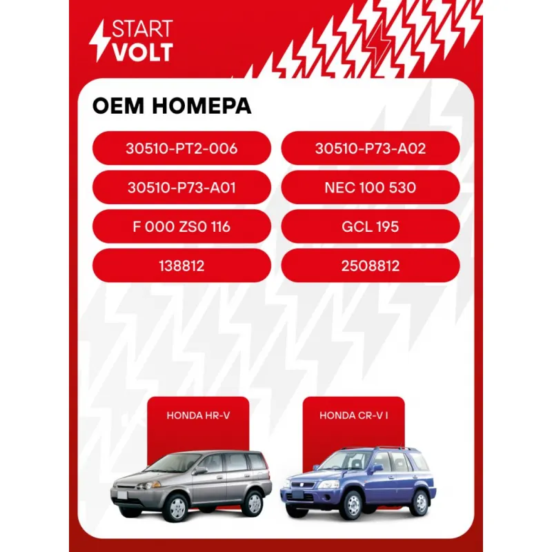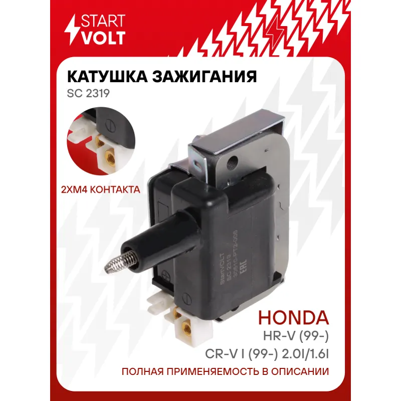Катушка зажигания для автомобилей Honda HR-V (99-)/CR-V I (99-) 2.0i/1.6i Характеристики: Артикул: SC 2319 OEM номера: 30510-PT2-006, 30510-P73-A02, 30510-P73-A01, NEC 100 530, F 000 ZS0 116, GCL 195, 138812, 2508812 Количество контактов: 2xM4 Выходное напряжение, кВ: 30 Номинальное напряжение, В: 12 Наличие коммутатора: Отсутствует Первичное сопротивление, Ом: 0,8 Вторичное сопротивление, кОм: 13,8 Первичная индуктивность, мН: 4,2 Вторичная индуктивность, Н: 31,8 Энергия искры, мДж: 44 Подходит для авто: Honda Accord (90-), Civic V (91-), Civic VI (95-), CR-V I (95-) Для проверки применяемости отправьте VIN автомобиля через вкладку "Есть вопросы о товаре?" Комплектация: Паспорт изделия/гарантийный талон - 1 шт Катушка зажигания - 1 шт Гарантия: от 1 года.