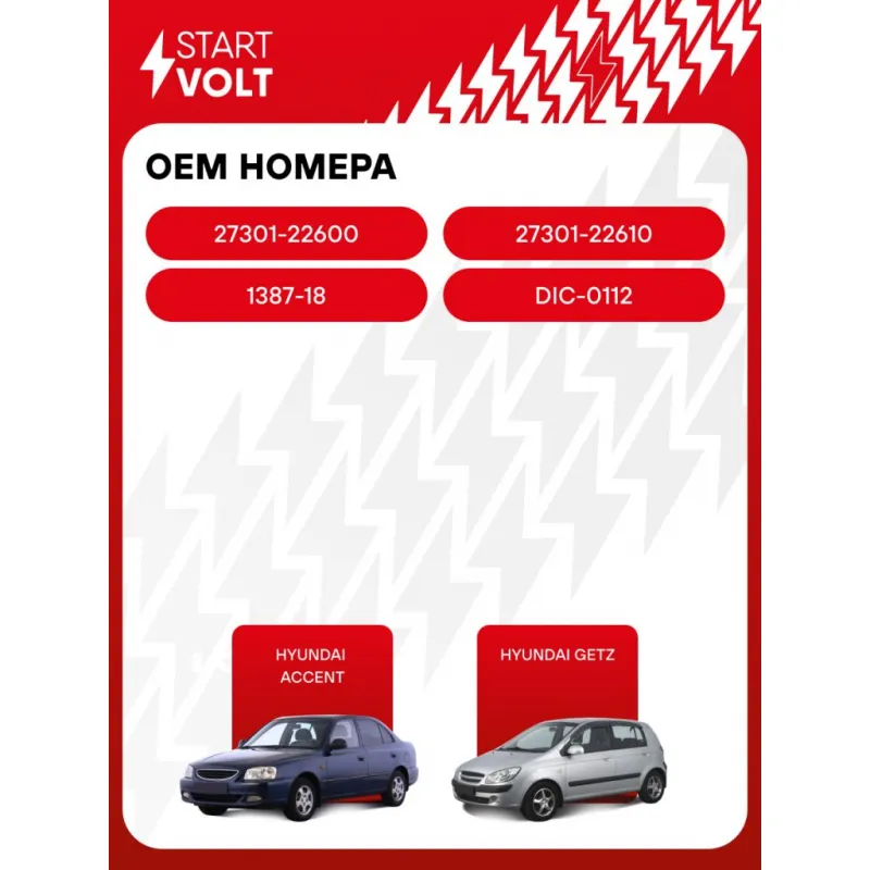 Катушка зажигания для автомобилей Hyundai Accent (99-)/Getz (02-) 1.3i/1.5i Характеристики: Артикул: SC 0811 OEM номера: 27301-22600, 27301-22610, 1387-18, DIC-0112 Количество контактов: 2/2/1 Выходное напряжение, кВ: 17,7 Номинальное напряжение, В: 12 Наличие коммутатора: Отсутствует Первичное сопротивление, Ом: 0,82 Вторичное сопротивление, кОм: 15,2 Первичная индуктивность, мН: 2,3 Вторичная индуктивность, Н: 24 Энергия искры, мДж: 63,8 Подходит для авто: Hyundai Elantra III (00-), Elantra IV (06-), Matrix (01-), Accent II (TagAZ) (01-), Accent II (99-), Getz (02-) Kia Picanto (04-), Cerato I (04-), Rio II (05-) Для проверки применяемости отправьте VIN автомобиля через вкладку "Есть вопросы о товаре?" Комплектация: Паспорт изделия/гарантийный талон - 1 шт Катушка зажигания - 1 шт Гарантия: от 1 года.