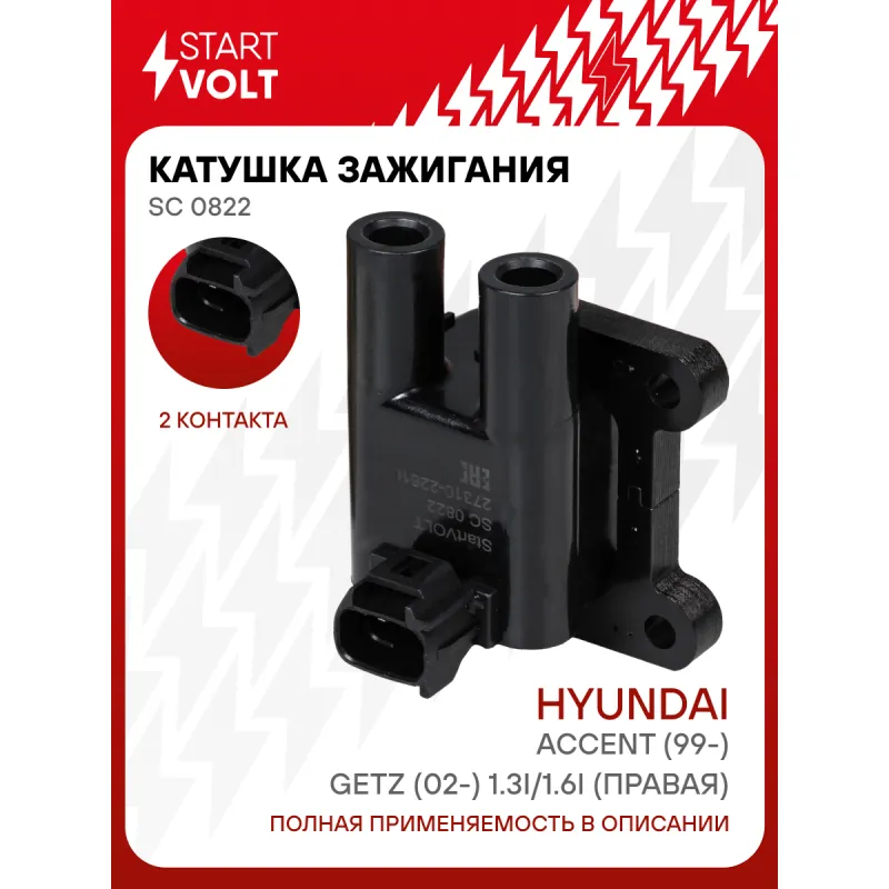 Катушка зажигания для автомобилей Hyundai Accent (99-)/Getz (02-) 1.3i/1.6i (правая) SC 0822 StartVolt