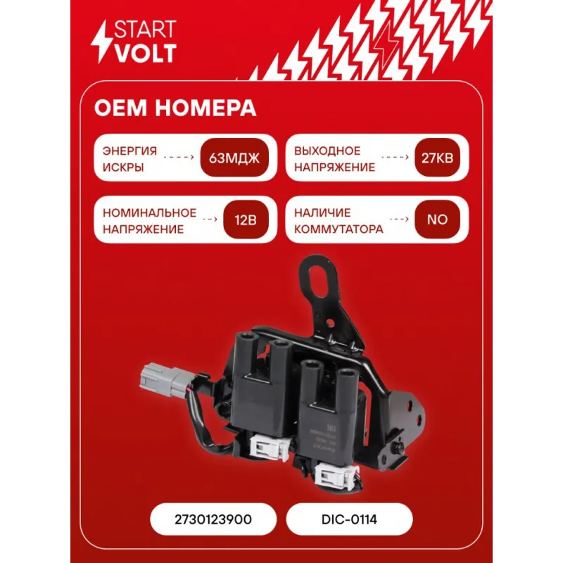 Катушка зажигания для автомобилей Kia Sportage II (04-)/Ceed (06-) 2.0i Характеристики: Артикул: SC 0820 OEM номера: 2730123900, DIC-0114 Количество контактов: 3 Выходное напряжение, кВ: 27 Номинальное напряжение, В: 12 Наличие коммутатора: нет Первичное сопротивление, Ом: 0,77 Вторичное сопротивление, кОм: 14,3 Первичная индуктивность, мН: 2,2 Вторичная индуктивность, Н: 19,9 Энергия искры, мДж: 63 Подходит для авто: Hyundai i30 I (07-), Elantra IV (06-) Kia Sportage II (04-), CEE'D (07-), Cerato I (04-) Для проверки применяемости отправьте VIN автомобиля через вкладку "Есть вопросы о товаре?" Комплектация: Катушка зажигания - 1 шт Паспорт изделия/гарантийный талон - 1 шт Гарантия: от 1 года.