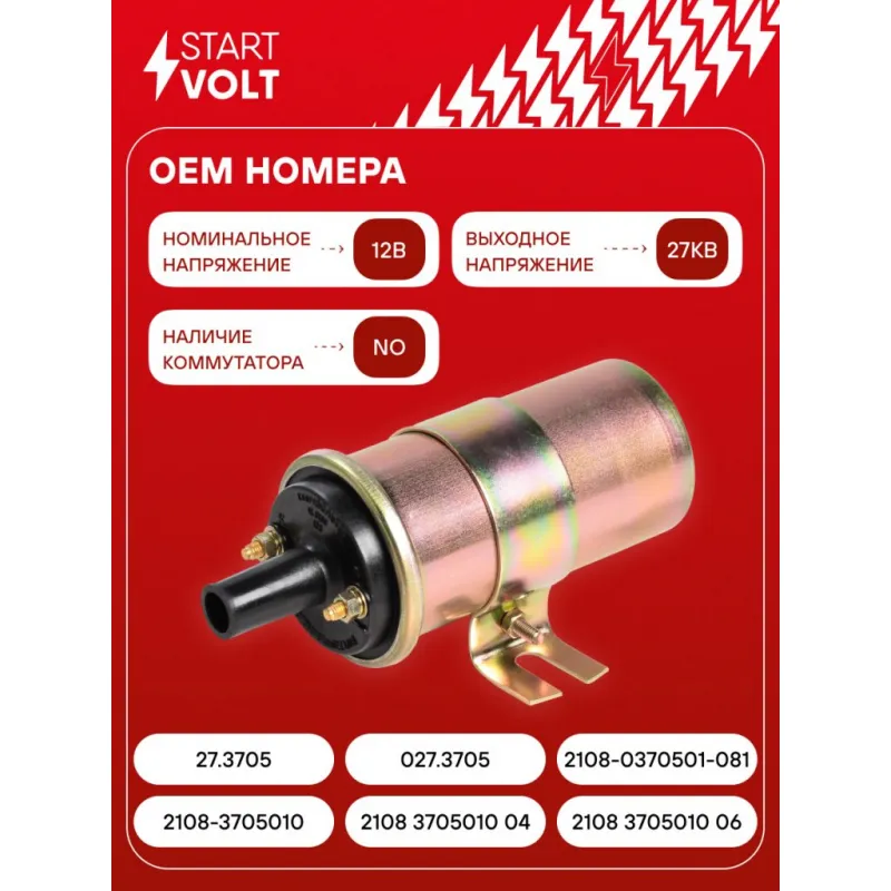 Катушка зажигания для автомобилей Лада 2103-2107/2108-21099/2121-21213 Характеристики: Артикул: SC 0108 OEM номера: 2108-3705010, 2108 3705010 04, 2108 3705010 06, 27.3705, 027.3705, 2108-0370501-081 Количество контактов: 2xM5 Выходное напряжение, кВ: 27 Номинальное напряжение, В: 12 Наличие коммутатора: Отсутствует Подходит для авто: ВАЗ 2108, 2109, 21099, 21099, 2108, 2109, 21099 ЗАЗ 1102, 1103, 1105 Для проверки применяемости отправьте VIN автомобиля через вкладку "Есть вопросы о товаре?" Комплектация: Паспорт изделия/гарантийный талон - 1 шт Катушка зажигания - 1 шт Гарантия: от 1 года.