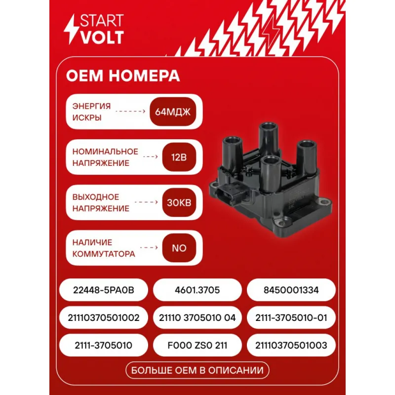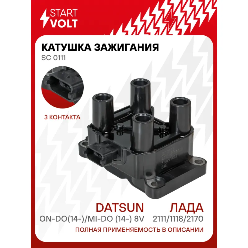 Катушка зажигания для автомобилей Лада 2111/1118/2170/Datsun On-Do(14-)/Mi-Do (14-) 8v Описание: Катушка зажигания SC 0111 бренда STARTVOLT предназначена для работы в системе зажигания автомобиля; служит для преобразования низковольтного напряжения, поступающего от аккумуляторной батареи или генератора, в высоковольтное. Особенности SC 0111: - Наличие коммутатора - отсутствует; - Применяемость катушки зажигания для автомобилей: BOGDAN 2110, 2111, 2310, CHEVROLET NIVA, DATSUN on-DO, LADA ВАЗ 2110-2112, GRANTA, KALINA, NIVA, ВАЗ 2101-2107, PRIORA, SAMARA.. Подбор по VIN-номеру вашего автомобиля - через кнопку 'Задать вопрос'. Специалист проверит применяемость и ответит вам. Катушка зажигания представляет собой высоковольтный импульсный повышающий трансформатор системы зажигания ДВС, первичная обмотка которого имеет небольшое количество витков и рассчитана на импульсы низкого напряжения, например 12, либо 24 вольт, вторичная обмотка выполнена из тончайшего провода с огромным количеством витков, благодаря чему во вторичной обмотке создаётся высокое выходное напряжение до 25 000 — 35 000 вольт по формуле: напряжение = индукция в витке х количество витков. Высокое напряжение от катушки зажигания с помощью высоковольтного кабеля подается на распределитель трамблер от него с помощью высоковольтных кабелей напряжение распределяется по свечам зажигания. Высокое напряжение обеспечивает дугу разряда между электродами свечи, тем самым воспламеняя горючую смесь. Характеристики: Артикул: SC 0111 OEM номера: 2111-3705010, F000 ZS0 211, 21110370501003, 21110370501002, 21110 3705010 04, 2111-3705010-01, 22448-5PA0B, 4601.3705, 8450001334, 2111.3705010-03, 2111.3705, 9311600, 2508717, 138717, 2111-3705010-02, 211103705010, 21110370501001, 21110370501000, 211103705010030, 22448-5PA0A Количество контактов: 3 Подходящий разъем AIRLINE:: AECC029, AECC341 Выходное напряжение, кВ: 30 Номинальное напряжение, В: 12 Наличие коммутатора: отсутствует Первичное сопротивление, Ом: 0,45 Вторичное сопротивление, кОм: 12,5 Первичная индуктивность, мН: 3,9 Вторичная индуктивность, Н: 24,8 Энергия искры, мДж: 64 Подходит для авто: ВАЗ 2111, 2112, Kalina (04-), Granta (10-), Kalina II (13-), Priora (07-), 2110, Kalina (04-) Chevrolet Niva (02-) Для проверки применяемости отправьте VIN автомобиля через вкладку "Есть вопросы о товаре?" Комплектация: Паспорт изделия/гарантийный талон - 1 шт Катушка зажигания - 1 шт Гарантия: от 1 года.