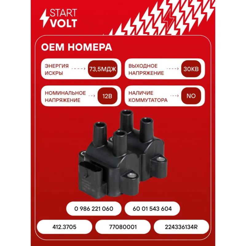 Катушка зажигания для автомобилей Лада Largus (12-)/Renault Logan (04-) (после 2012г.) 1.6i 8v Характеристики: Артикул: SC 0904 OEM номера: 224336134R, 60 01 543 604, 0 986 221 060, 412.3705, 77080001 Количество контактов: 4 Подходящий разъем AIRLINE:: AECC074 Выходное напряжение, кВ: 30 Номинальное напряжение, В: 12 Наличие коммутатора: Отсутствует Первичное сопротивление, Ом: 0,59 Вторичное сопротивление, кОм: 8,63 Первичная индуктивность, мН: 2,71 Вторичная индуктивность, Н: 20,1 Энергия искры, мДж: 73,5 Подходит для авто: Renault Logan (04-) ВАЗ Largus (12-) Для проверки применяемости отправьте VIN автомобиля через вкладку "Есть вопросы о товаре?" Комплектация: Катушка зажигания - 1 шт Паспорт изделия/гарантийный талон - 1 шт Сувенирная бирка сервисного обслуживания - 1 шт Гарантия: от 1 года.